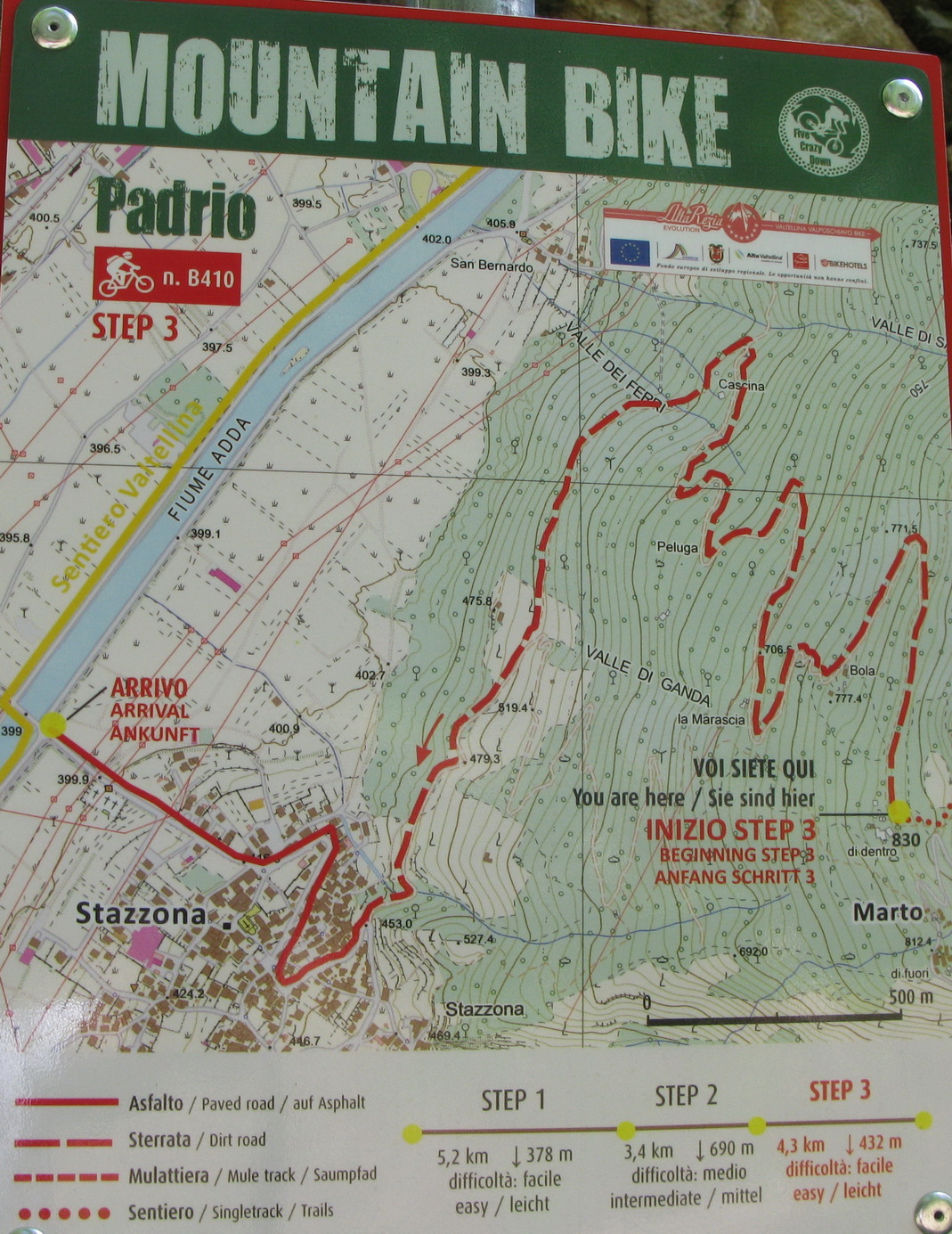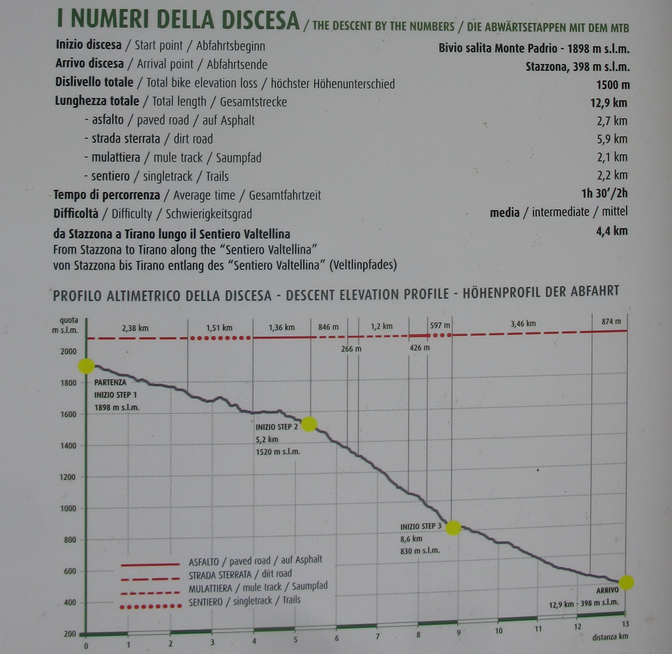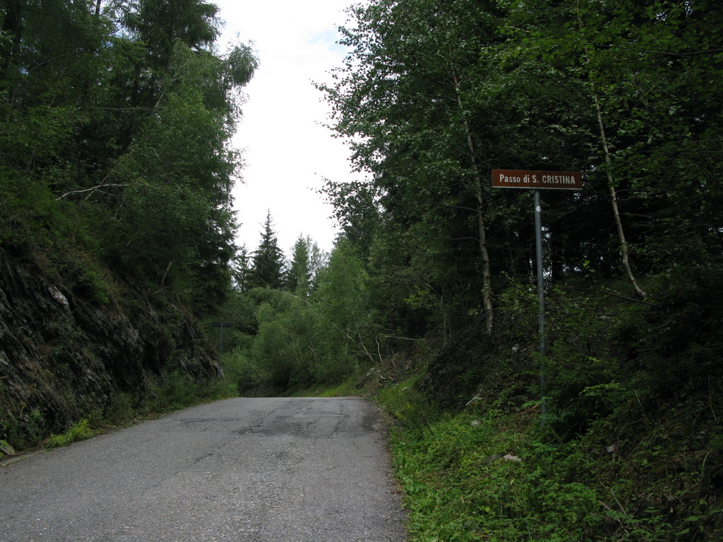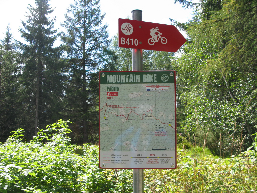 Nenápadný kopček medzi Tiranom a lyžiarskym strediskom Apricou s názvom Monte Padrio bol posledným piatym zjazdom zo spomínanej informačnej tabule. Nemal som informáciu o najideálnejšej výstupovej trase a tak som sa hore premotal asfaltkami z mestečka Tirano. Úzke asfaltky v hustom ihličnatom lese boli celkom príjemné. Pod Padriom som našiel informačnú tabuľu z ktorej som sa dozvedel všetko potrebné k ďalšiemu zjazdu do série.