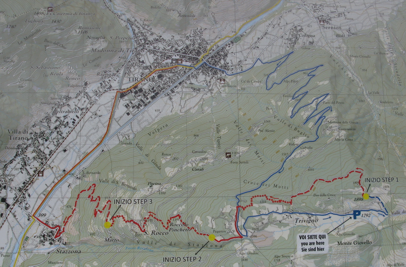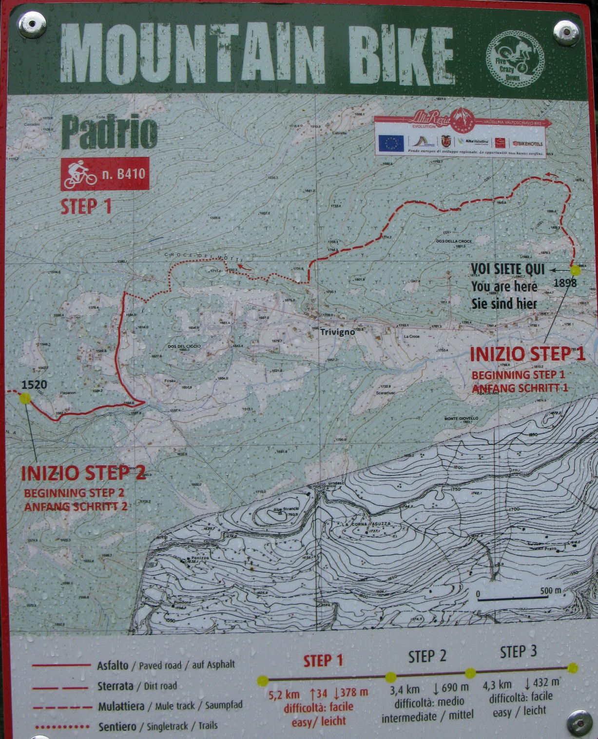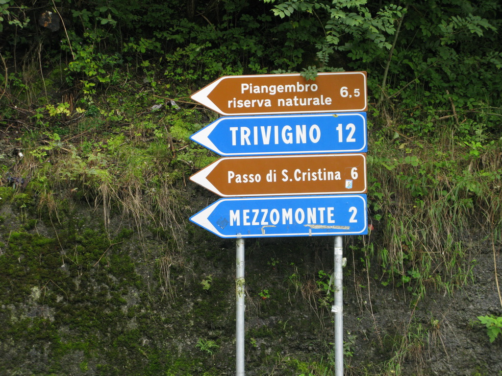 Nenápadný kopček medzi Tiranom a lyžiarskym strediskom Apricou s názvom Monte Padrio bol posledným piatym zjazdom zo spomínanej informačnej tabule. Nemal som informáciu o najideálnejšej výstupovej trase a tak som sa hore premotal asfaltkami z mestečka Tirano. Úzke asfaltky v hustom ihličnatom lese boli celkom príjemné. Pod Padriom som našiel informačnú tabuľu z ktorej som sa dozvedel všetko potrebné k ďalšiemu zjazdu do série.