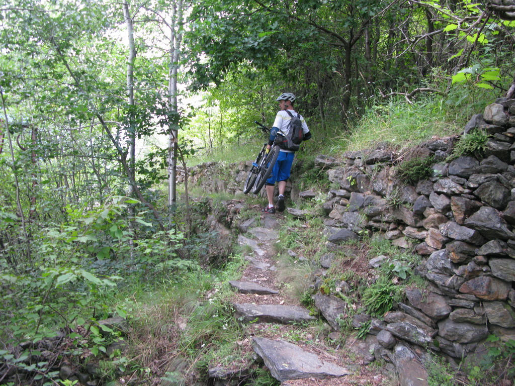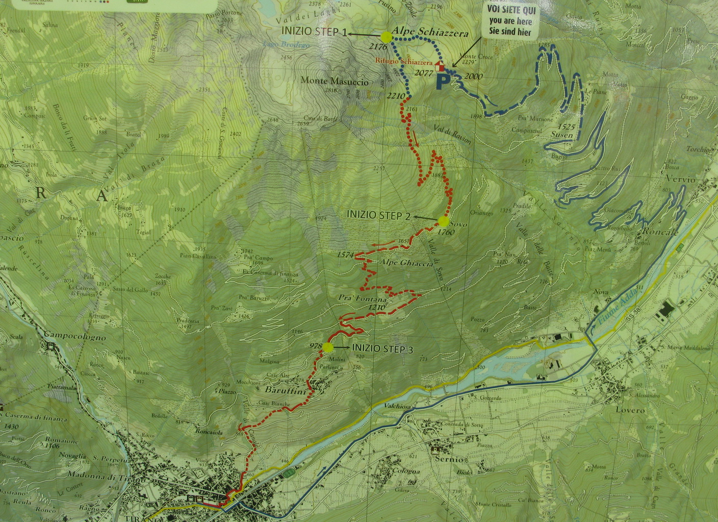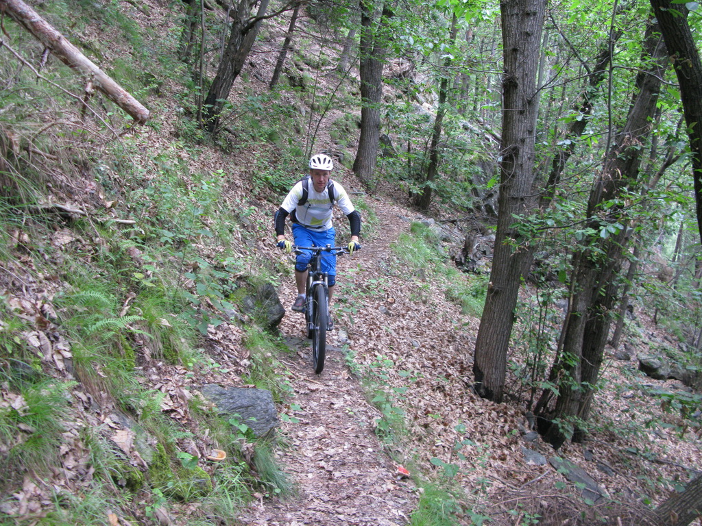Opäť sa vnárame do lesa. Asfalt končí ale cesta je naďalej luxusná. Prichádzame naparkovisko pod chatou. Až potiaľto je možné prísť s autom, nie je tu žiadny zákaz. Na parkovisku už nachádzame našu starú známu tabuľu s mapkou trailu, popismi, profilom. Päť Valtellinských zjazdov je plánovaných pre jazdcov, ktorí jazdia s podporou auta a preto značenie začína vždy až od parkoviska...