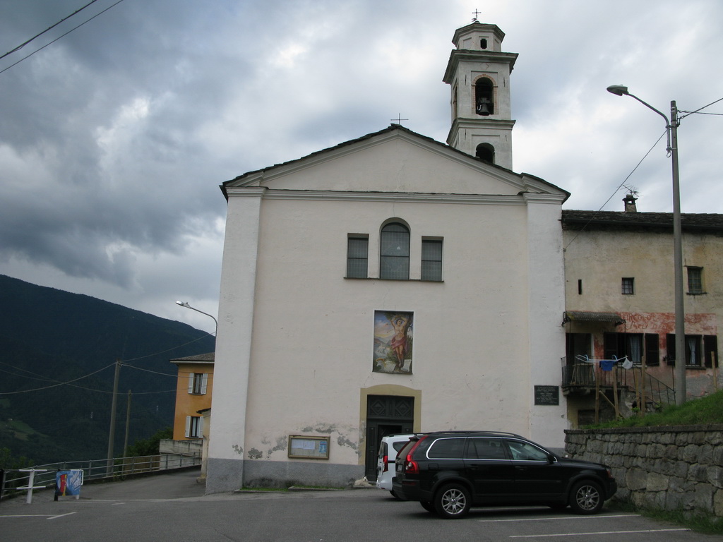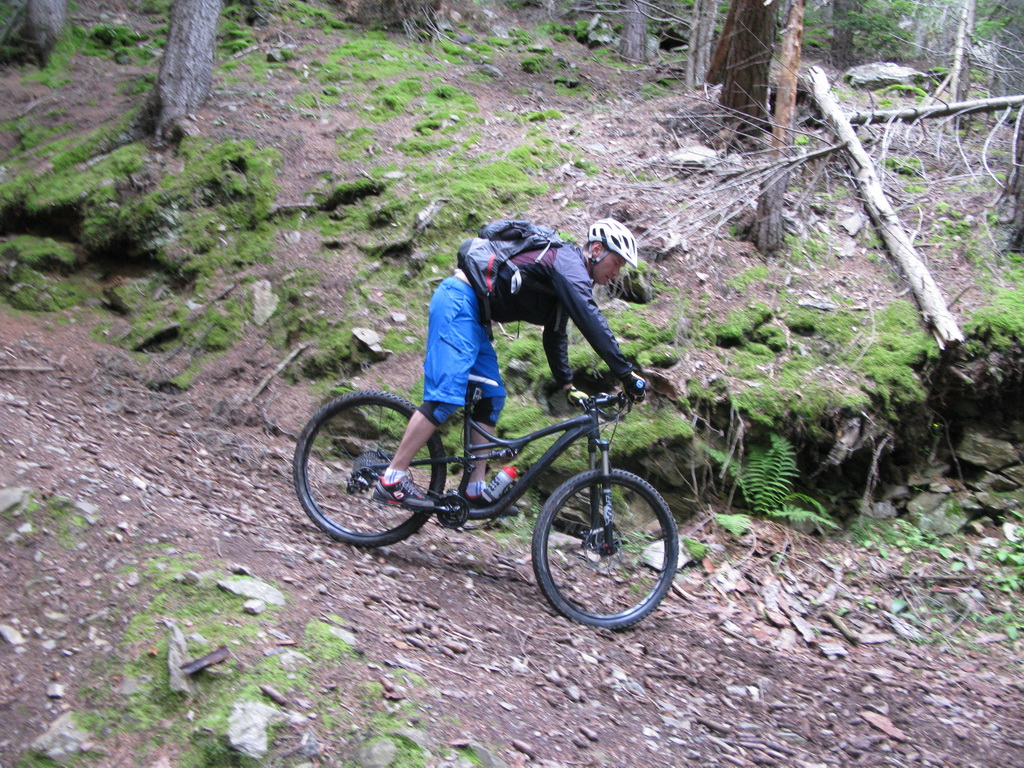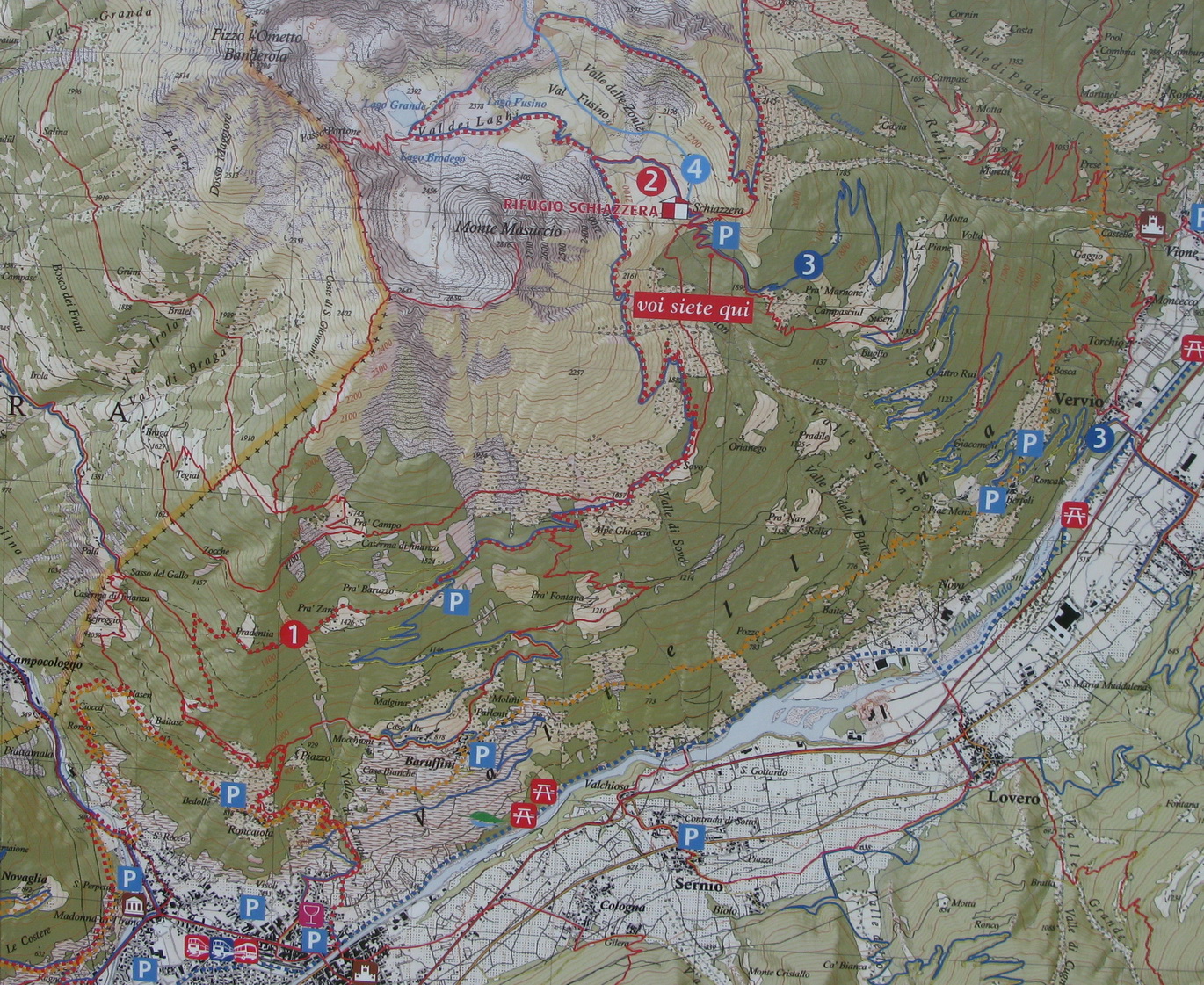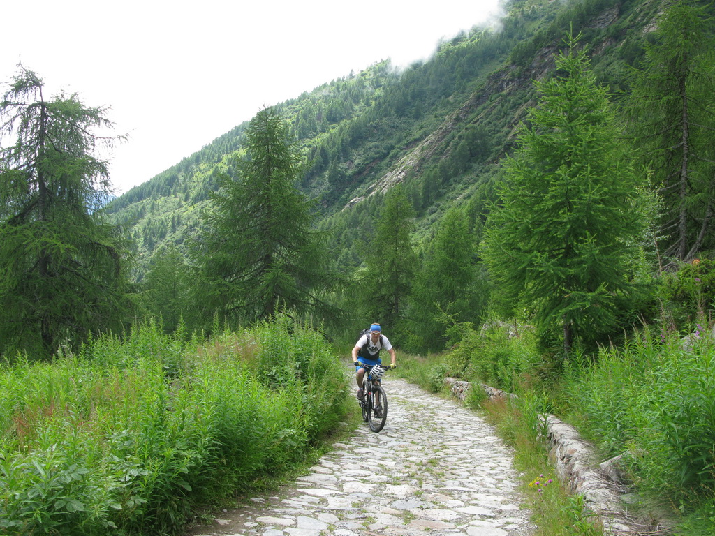 Opäť sa vnárame do lesa. Asfalt končí ale cesta je naďalej luxusná. Prichádzame naparkovisko pod chatou. Až potiaľto je možné prísť s autom, nie je tu žiadny zákaz. Na parkovisku už nachádzame našu starú známu tabuľu s mapkou trailu, popismi, profilom. Päť Valtellinských zjazdov je plánovaných pre jazdcov, ktorí jazdia s podporou auta a preto značenie začína vždy až od parkoviska...