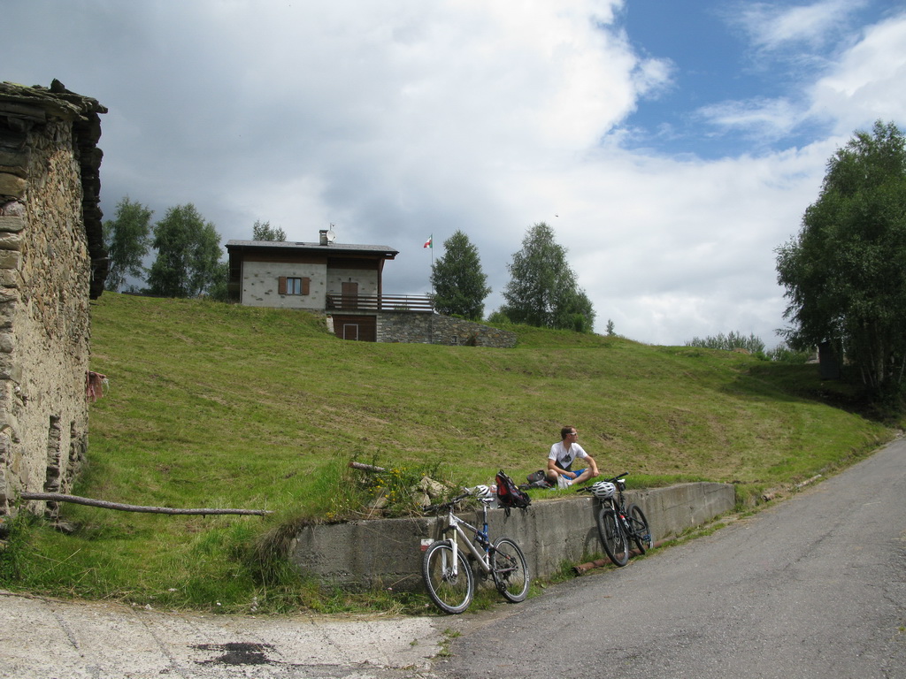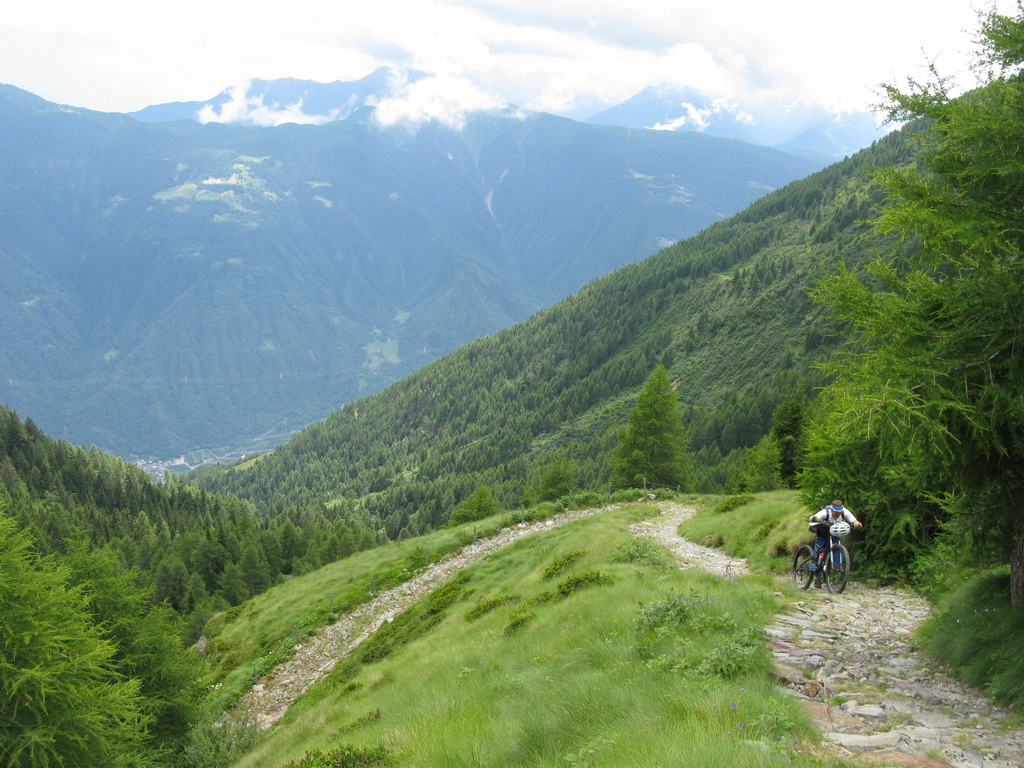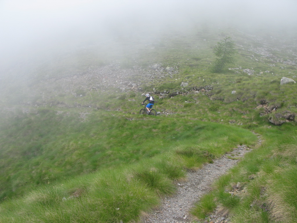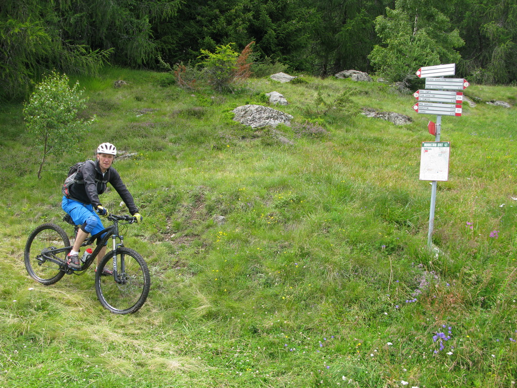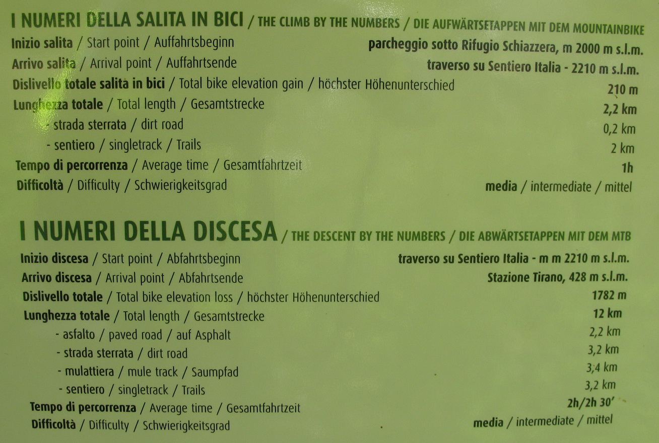 Nad chatou nás čaká ešte stúpanie cca 200v.m. ku začiatku zjazdu. Niečo tlačíme niečo dáme v sedle. Začiatok zjazdu je označený tabuľkou, mapkou. Vieme že sme dobre. Z hora tu prichádza chodník, ktorý je v mape tiež označený ako zjazdný pre bajkerov. Ten chodník traverzuje hory na dlhom úseku a začína až niekde v úplnom závere Val Grosiny. Je to jeden z tipov do budúcnosti, spojiť ten traverz z následným zjazdom do Tirana to by bola určite supertúra.