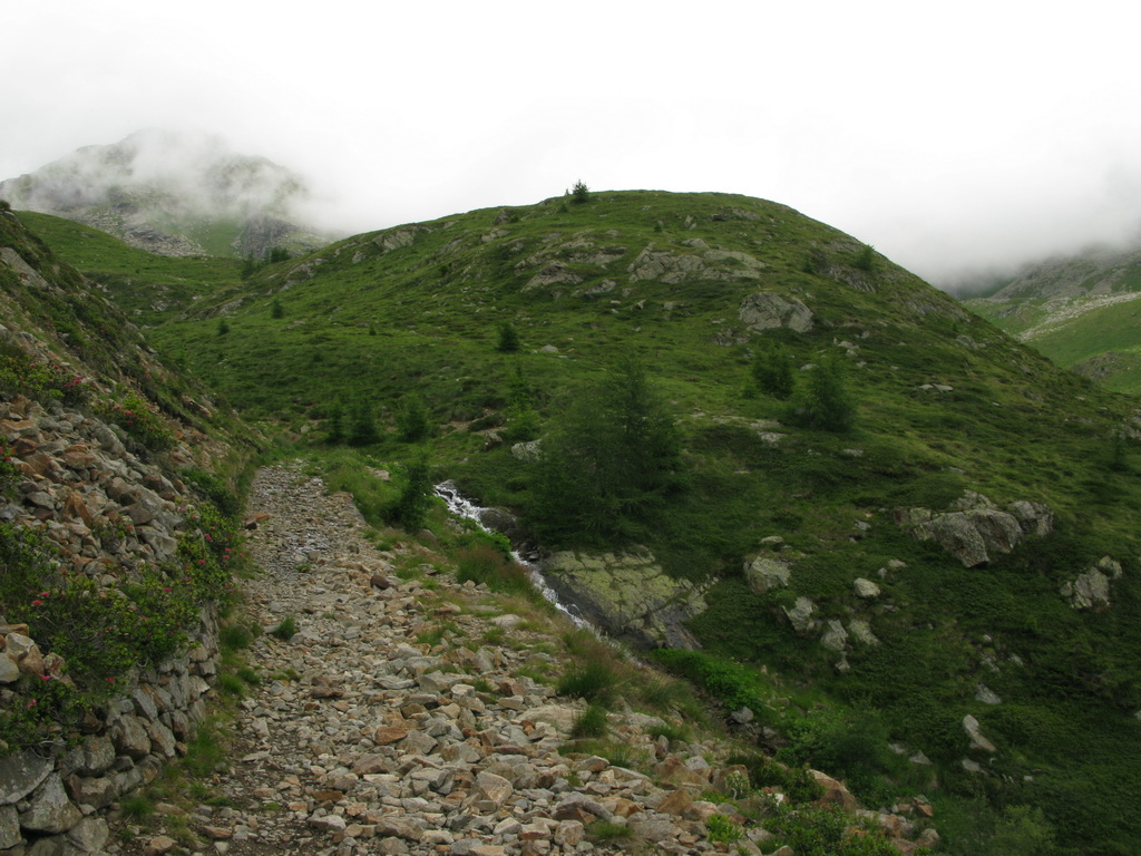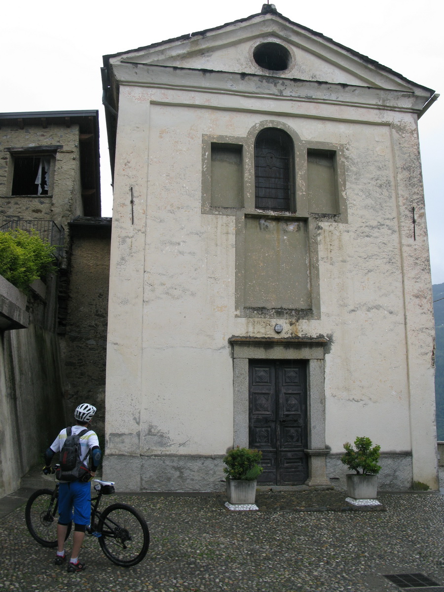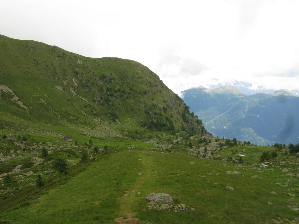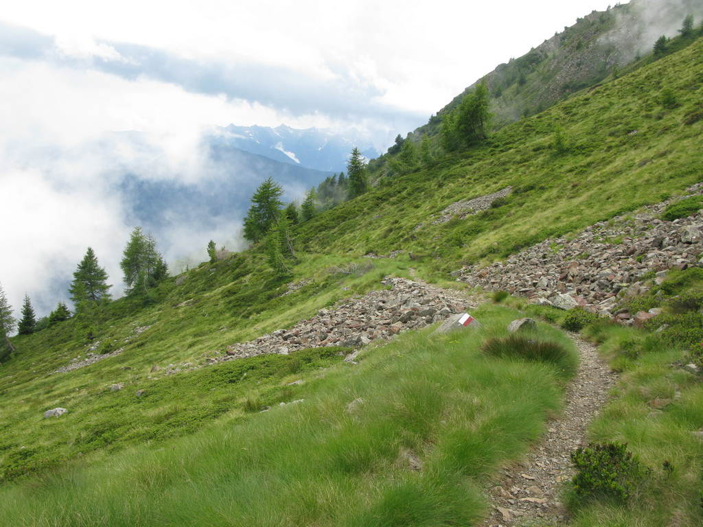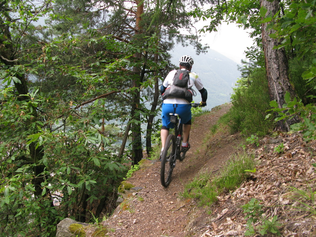 Nad chatou nás čaká ešte stúpanie cca 200v.m. ku začiatku zjazdu. Niečo tlačíme niečo dáme v sedle. Začiatok zjazdu je označený tabuľkou, mapkou. Vieme že sme dobre. Z hora tu prichádza chodník, ktorý je v mape tiež označený ako zjazdný pre bajkerov. Ten chodník traverzuje hory na dlhom úseku a začína až niekde v úplnom závere Val Grosiny. Je to jeden z tipov do budúcnosti, spojiť ten traverz z následným zjazdom do Tirana to by bola určite supertúra.