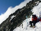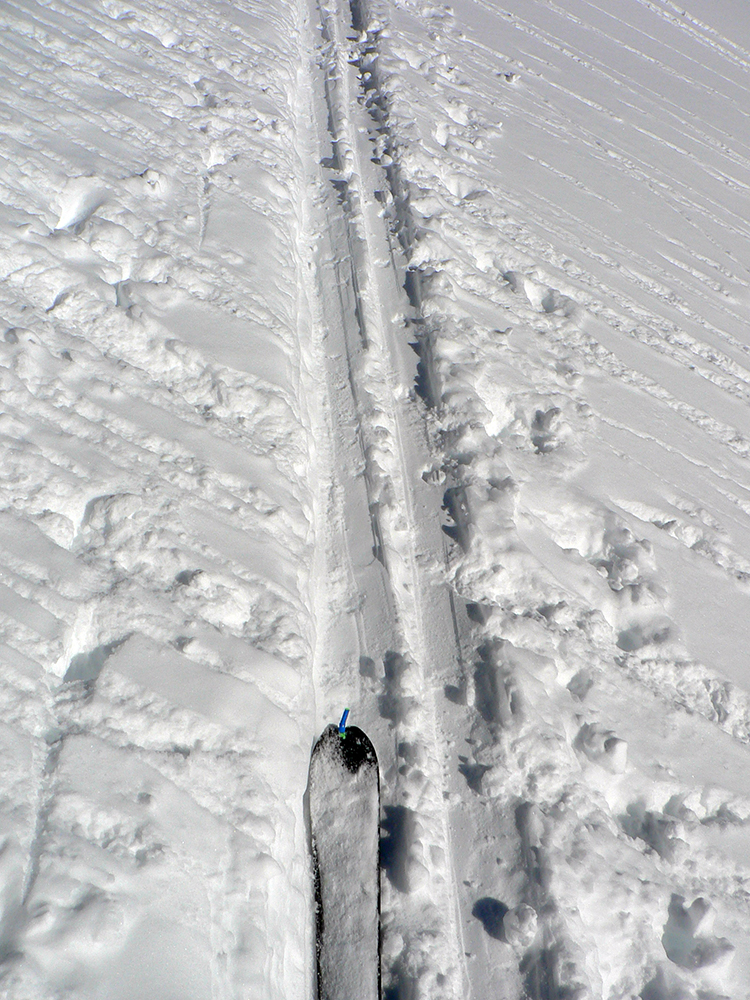 Traverz pod Závrat, to bola vyleštená diaľnica. A aha, konečne aj nejakí ľudia :-) Všetko naokolo poorané do mŕtva, ale stopa komfort, len aj tu už miestami dosť preleštená a na vkus mojich pásov dáka príliš strmá. No a záver na pešo, mrte previateho snehu, ktorý už trochu oťažel. Rýchly pohľad do Rovienkovej doliny, na tú stranu to vyzeralo lyžovateľnejšie, lebo celkom povrchovo rovné, nerozryté. Ale v sedle zas ten jedovatý vetrík, tak rýchlo pomaly dolu a najmä na slnko.