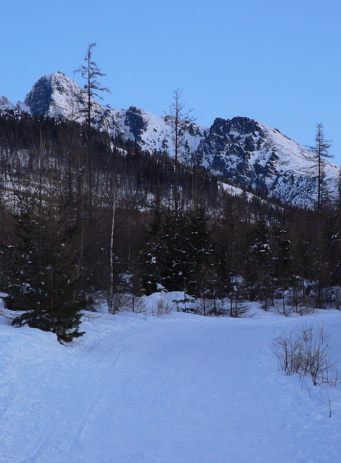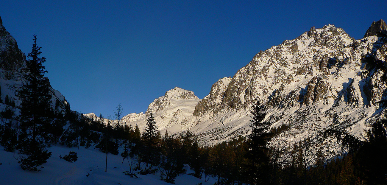 Po prepršaných sviatkoch, kadejakých kalamitách a šliapaní v sivote a mlieku to teda konečne raz vyšlo. Predpoveď hlásila azúro, aj keď trochu arktické, denný program hlásil cestu do KE na otočku, to bolo treba využiť, inak sa proste nedalo. Otočka v KE predvídavo naplánovaná na noc, takže už pred siedmou ráno som hrkotal a škrípal lyžami popri lanovke zo Smokovca. V Poprade -20, v Smokovci -16, ale bezvetrie. K tomu fialkové nebo, cestou na Hrebienok už nasvietené špičky štítov. Za chrbtom, na druhej strane kotliny, „rajské“ teplé farby východu slnka. K tomu pracovný pondelok kombinovaný s koronakrízou a „stanným právom“ - nikde ani nohy. Tatry pri peknom počasí bez ľudí??? Udalosť zázraku podobná. Počítal som aj so stopami, ktoré po podobne peknej nedeli budú naťahané určite všade tam, kam len budem chcieť, a aj keď porýľované to isto tiež bude dokonale, o lyžovačky mi nikdy nešlo, len sa dáko z kopca spustiť. Takže som čakal deň za odmenu, akých je málo. Aj taký vyšiel. Len toho snehu majú TA3 stále menej, ako by si zaslúžili.