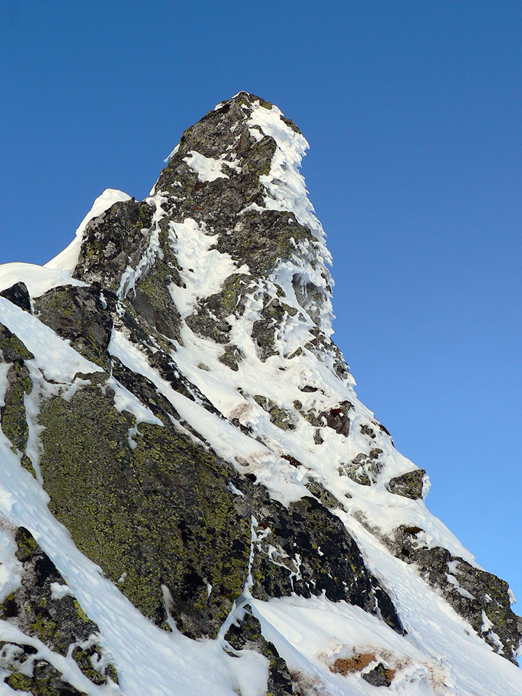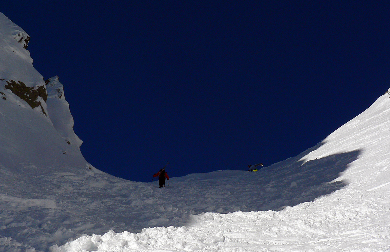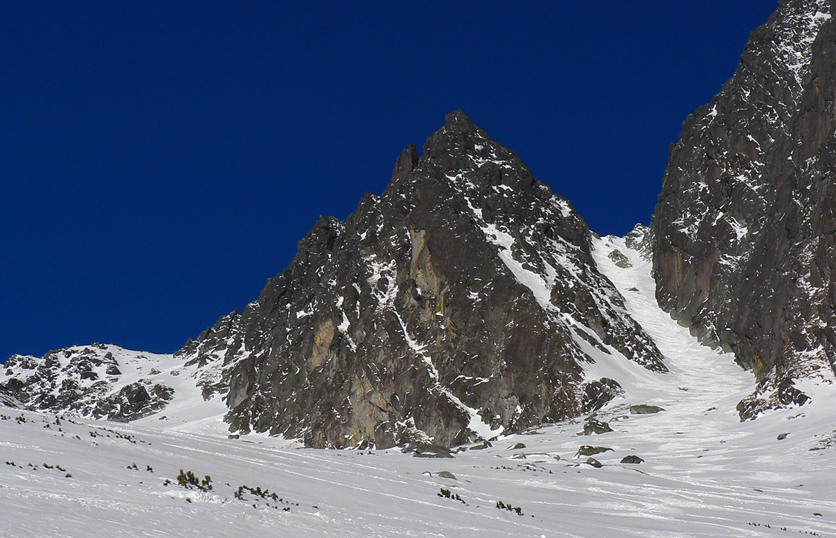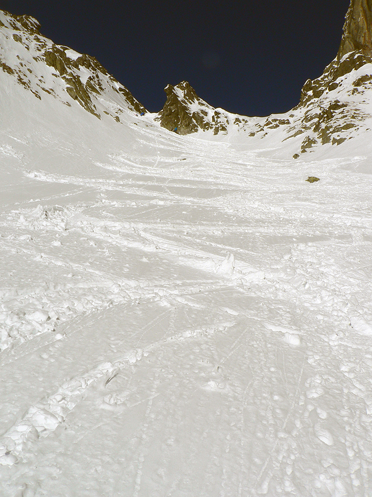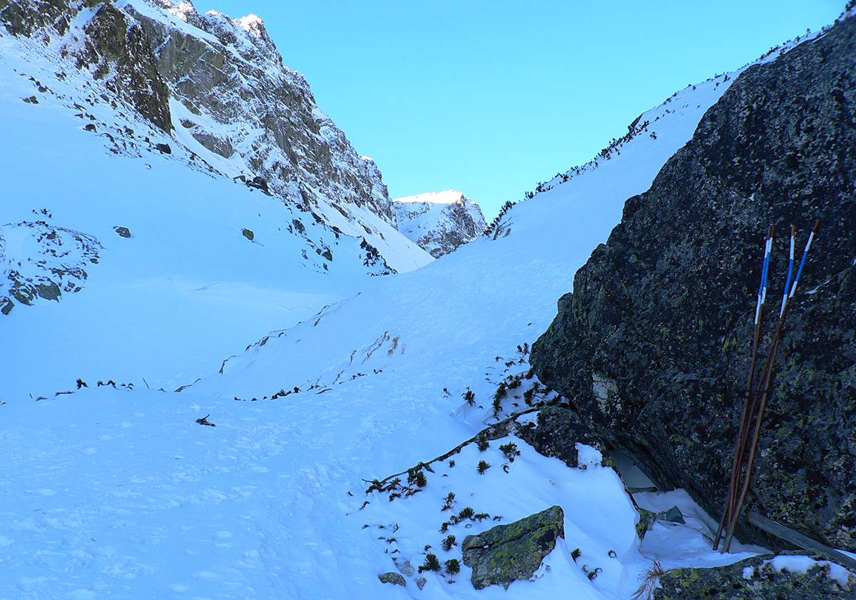 Takže ako prvý Prielom, celý v hlbokom tieni: stopa natiahnutá, ale zafúkaná, najmä v dolnej časti. A nie až hore – predchodca zrejme usúdil, že ten vrcholový prevej nie je moc bezpečný a ja som súhlasil. A mal som to za odmenu, nechcelo sa mi predupávať v tom kvante snehu, bola by to drina. Lyžovačka slušná, v hutnom, ufúkanom prašane, žraloky nehrýzli, len dole bolo treba na niektorých miestach zopatrnieť.