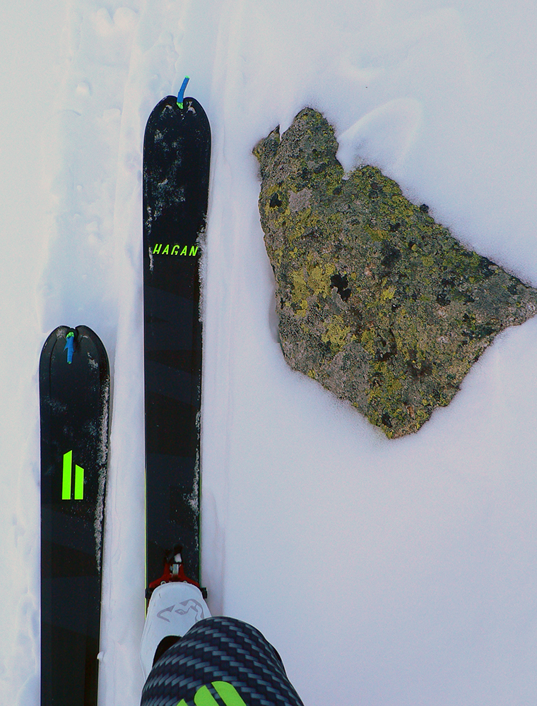 Svišťový štít ako druhý – prechod na slnko poriadne ostrý, aj teplotne. Vo svahu aj hore máličko snehu, aj problém vyjsť to celé na pásoch, v strede medzi tým ale naviate brucho a prebáračka do pol stehien. Zlyžovať sa dalo jediným miestom, ale aj tam som bol radšej opatrný. Napriek tomu to raz aj zaškrípalo spod hladiny. Bez následkov, našťastie. Pár plynulých oblúkov len v prášku smerom von z kotla, popri výstupovej stope.