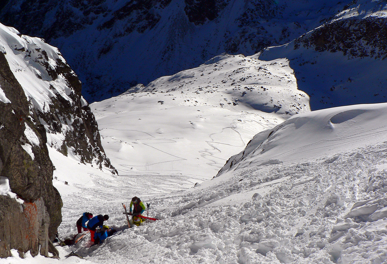 Čakal posledný výšľap - do Priečneho sedla. Traverz popod Javorovú galériu miestami pekne kameňatý, poriadne veľa snehu chýba. A sneh na popoludňajšom slnku až mokol, aj sa mi taká malá papučka na jednom páse začínala robiť. Prebrúsime, prevoskujeme, uvidíme. Ďalej už dobre, cikcaky do sedla také akurátne lepivé. Hore zas prevej a poriadny, ešte že zhora schádzala partia, nechali mi obstojné schodíky. Inak by to bol aj tu boj s vajcovým snehom bez základu. Chce to veru sadnúť a pripadnúť. Lebo potom aj lyžba dole bola taká divná – v hlbokom, od slnka ťažkom snehu som mal dojem, že je ho tu stráášne veľa, ale sem – tam sa ozvalo škrtnutie, to žraloky zubami cvakali. A boli to poriadne kusy.