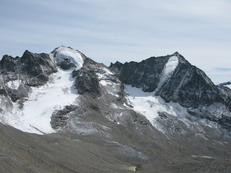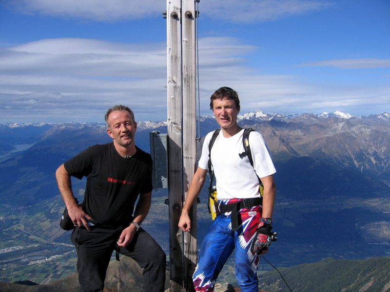 Na vrchole stretávame turistov, ktorý dnes vyrážali z chaty a vliekli so sebou celú výstroj... Máme šťastie na počasie a sme odmenení výhľadmi na dolinu Vinschgau o 2500 metrov nižšie. Pri zostupe mi Christian vysvetľuje, ako robili prechod hrebeňom Konigspitze - Zebrú - Ortler. Jednotlivé úseky mi hneď ukazuje "naživo". Výhľad máme perfektný...