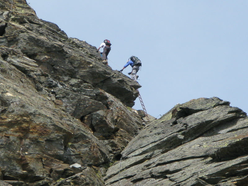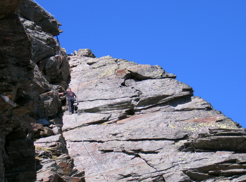 Na nástupe si dáme krátku pauzu. Spravíme zopár fotiek a vyrážame. Ideme bez istenia, Christian, ktorý ju staval povedal: "netreba". Na začiatku je jeden pekný exponovaný úsek. Dávam si pozor, idem pomaly a Christian mi hneď zmizne. Som príjemne prekvapený. Zdola to vyzeralo, ako suťovisko, skala je však pevná. Pekné lezenie. Idem rýchlo, nechcem zaostať. Na fotenie nemám čas. V závere však zbadám Christiana, ako práve prelieza peknú platňu. Rýchlo vytiahnem foťák a ešte s trasúcimi sa rukami a vysokým tepom ho cvaknem. Za pohotovosť som odmenený jedinou akčnou fotkou z ferraty. Ešte sa tu musím vrátiť a nafotiť to s niekým, ako pred nedávnom ferratu na Tabaretaspitze so Zolom.