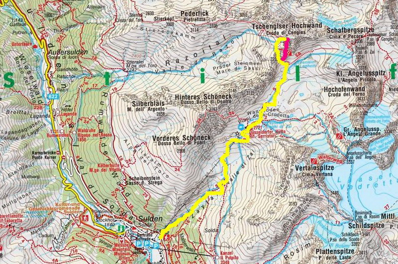 PRÍSTUP: Zo Slovenska je najlepší prístup po diaľnici cez Innsbruck, v Landecku odbočiť na Reschenpass, zísť dole do údolia Vinschgau a v Prade odbočiť smer passo Stelvio (Stilfserjoch), v dedinke Gomagoj odbočiť smer Sulden.