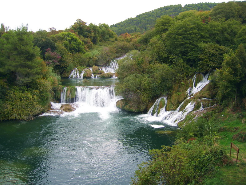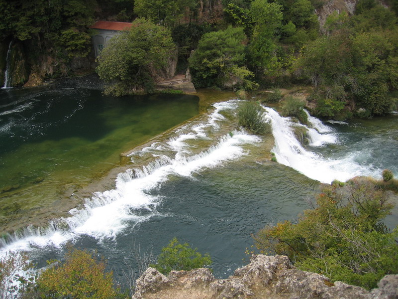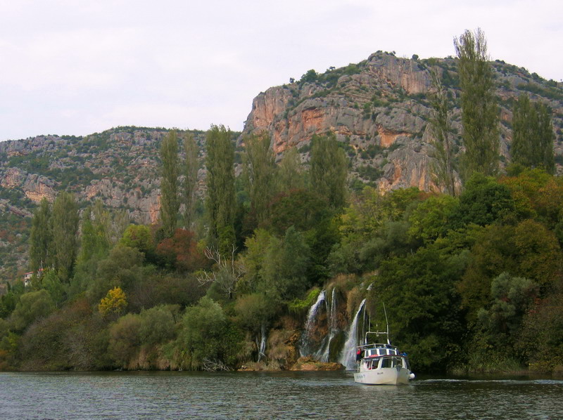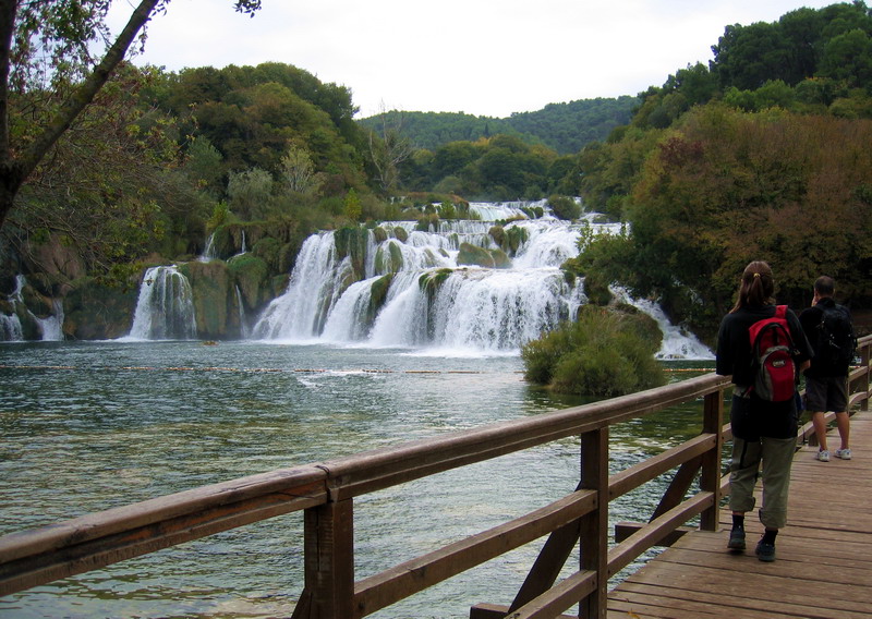 My sme sa tentoraz vybrali k vodopádom od mestečka Skradin. Nevedeli sme, že v cene lístka je aj doprava loďou a tak sme autom prišli až k mostu kúsok za Skradinom. Tu sme si v pokladni kúpili lístok a išli sme popri rieke peši asi 2,5 km k vodopádom. Pod vodopádmi sa dá dokonca kúpať, ale pod padajúcu vodu vás už nepustia. Sú tam natiahnuté bóje a je tam človek , ktorý na to dáva pozor.