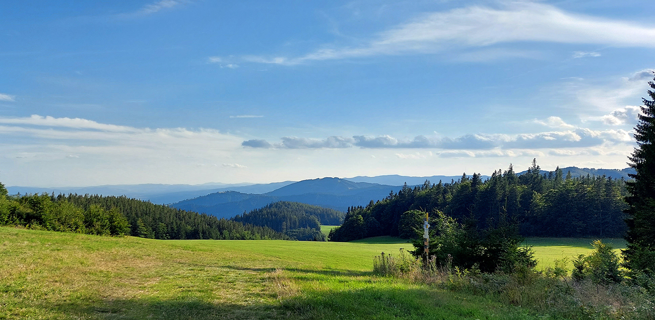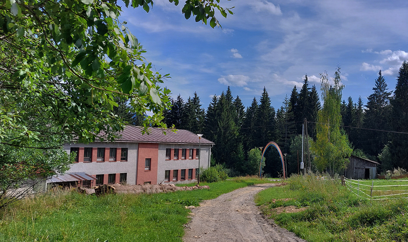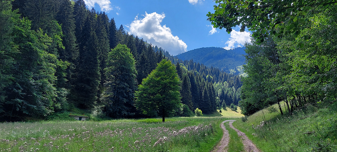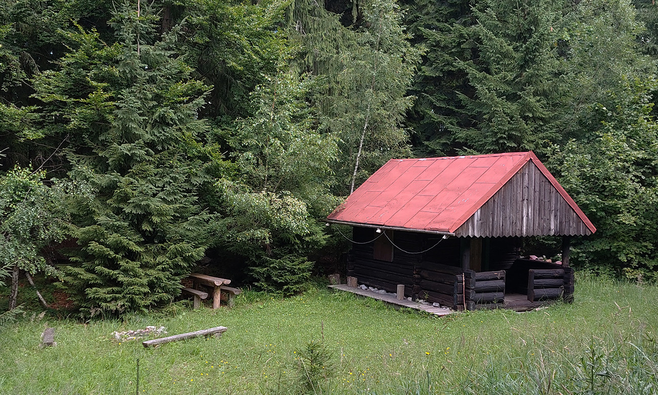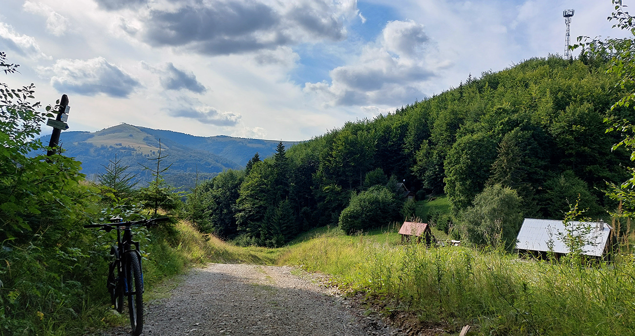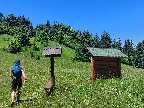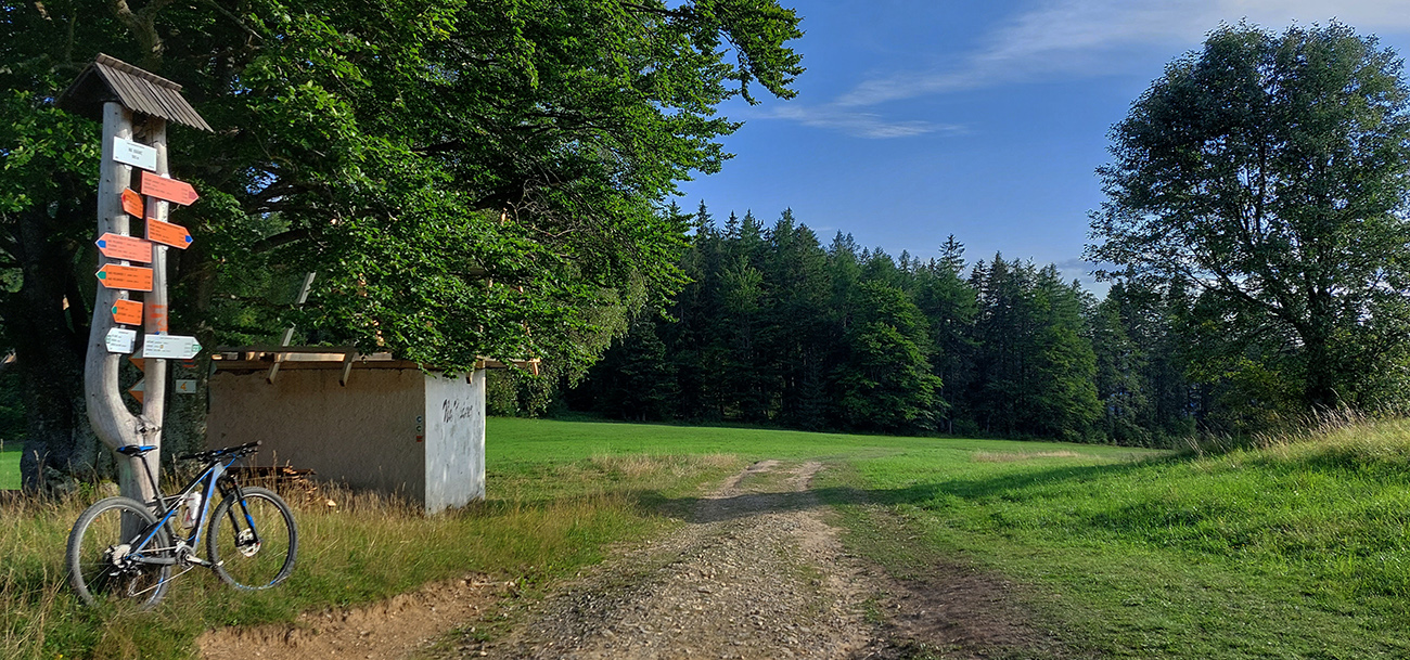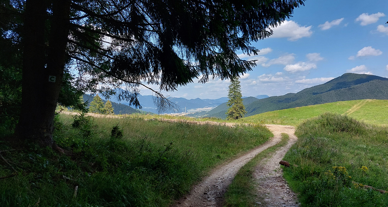 No a pod Vlkolíncom, od križovatky v Trlenskej doline, nasledovali pokusy o obchádzanie hlavnej cesty E77. Možnosti tu sú, tá v mojom smere najlepšia je zelená cyklotrasa 5422. Najprv peknou dolinou, potom príjemný tieň v lese, v druhej polovici aj rúbaniská a cez ne spätné pohľady k Sidorovu s Vlkolíncom. Nad Nižným Matejkovom sa cykloznačka síce točí nazad na sever, smerom na Jazierce, ale po východe z lesa mi stačilo len odbočiť po lúkach doprava a lúčna cesta ma zviedla, kam som potreboval. Síce som musel pár metrov prežiť aj na krajnici hlavnej cesty (krátky kultúrny šok hehehe), ale z Nižného do Vyšného Matejkova už príjemnejšie po lúkach, po červenej značke až ku známej kolibe Bodega.