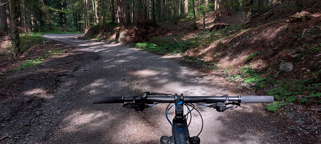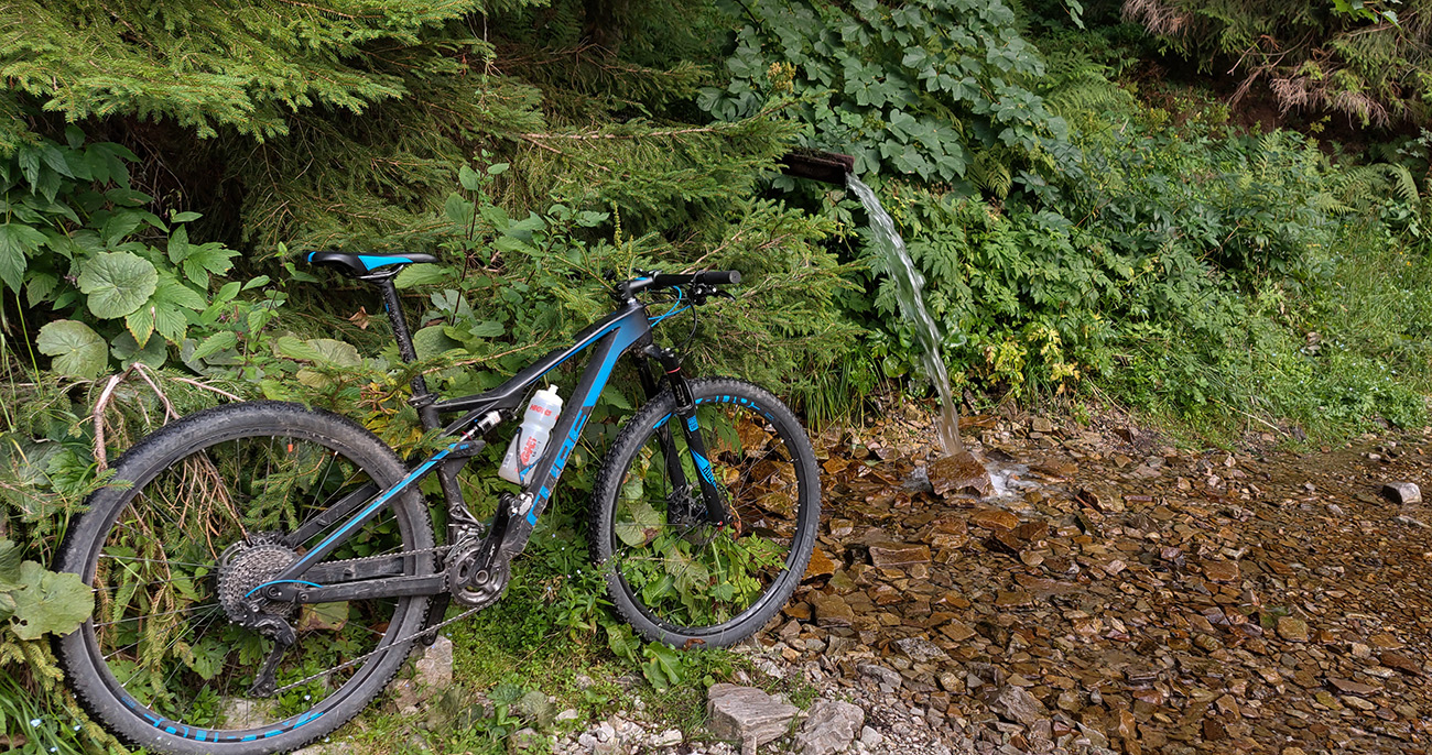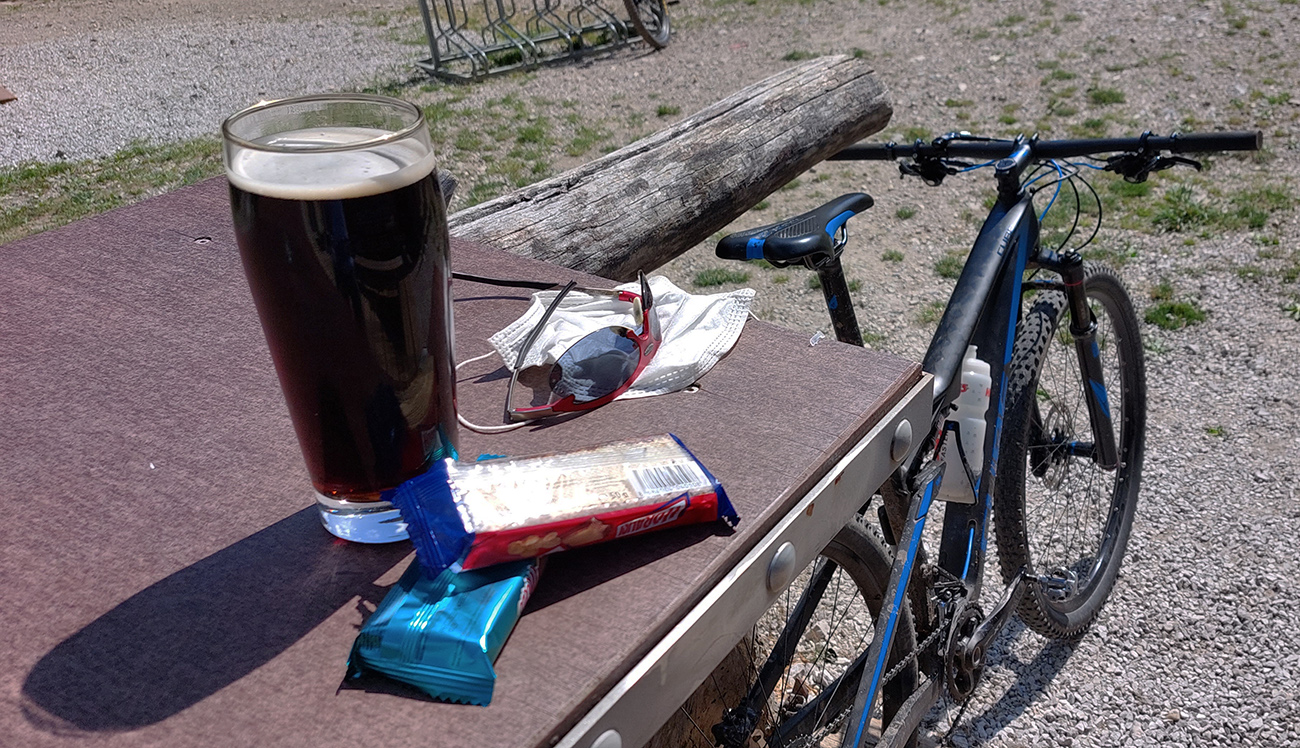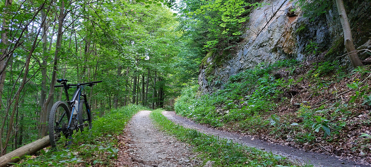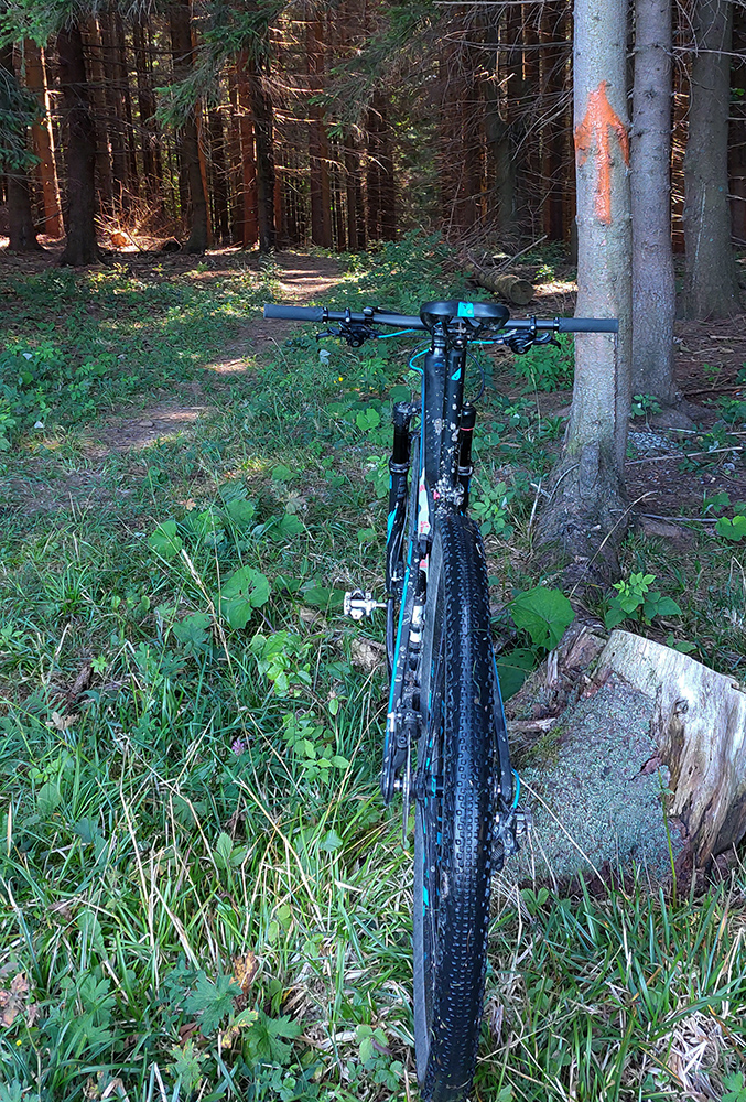 Na jar, keď som tu bol peši, išiel som doľava, tak teraz som skúsil doprava. Tam viac vlhka na severných svahoch, aj viac vody pod kolesami, takže trochu zarastenejšia, ale stále výborná cesta. Len asi po 500 m zrazu psssssssssssssssss! A už som obracal bajk hore bruchom a vymieňal dušu. Dáky tŕň či čo. Náhradnú som mal na ráme prilepenú a vrecká plné, takže po výmene išli dva banány do brucha a miesto nich tá deravá duša do dresu, lebo lepiacu pásku so sebou nenosím a ani batoh som nebral, veď civilizácia je tu všade blízko :-)