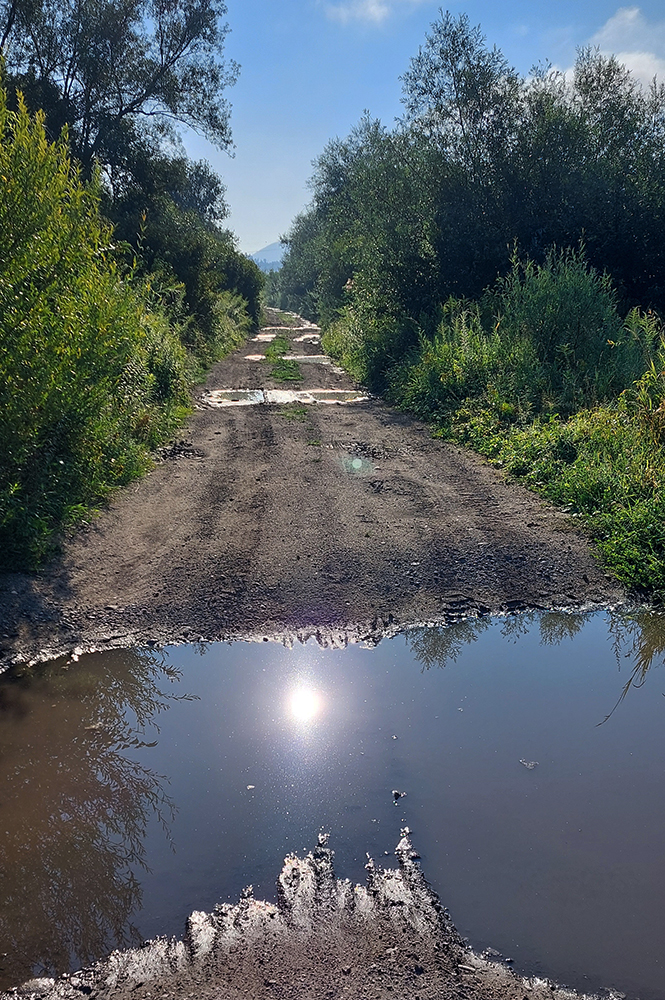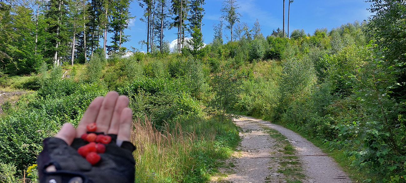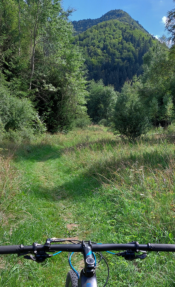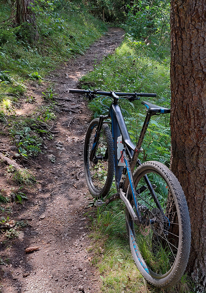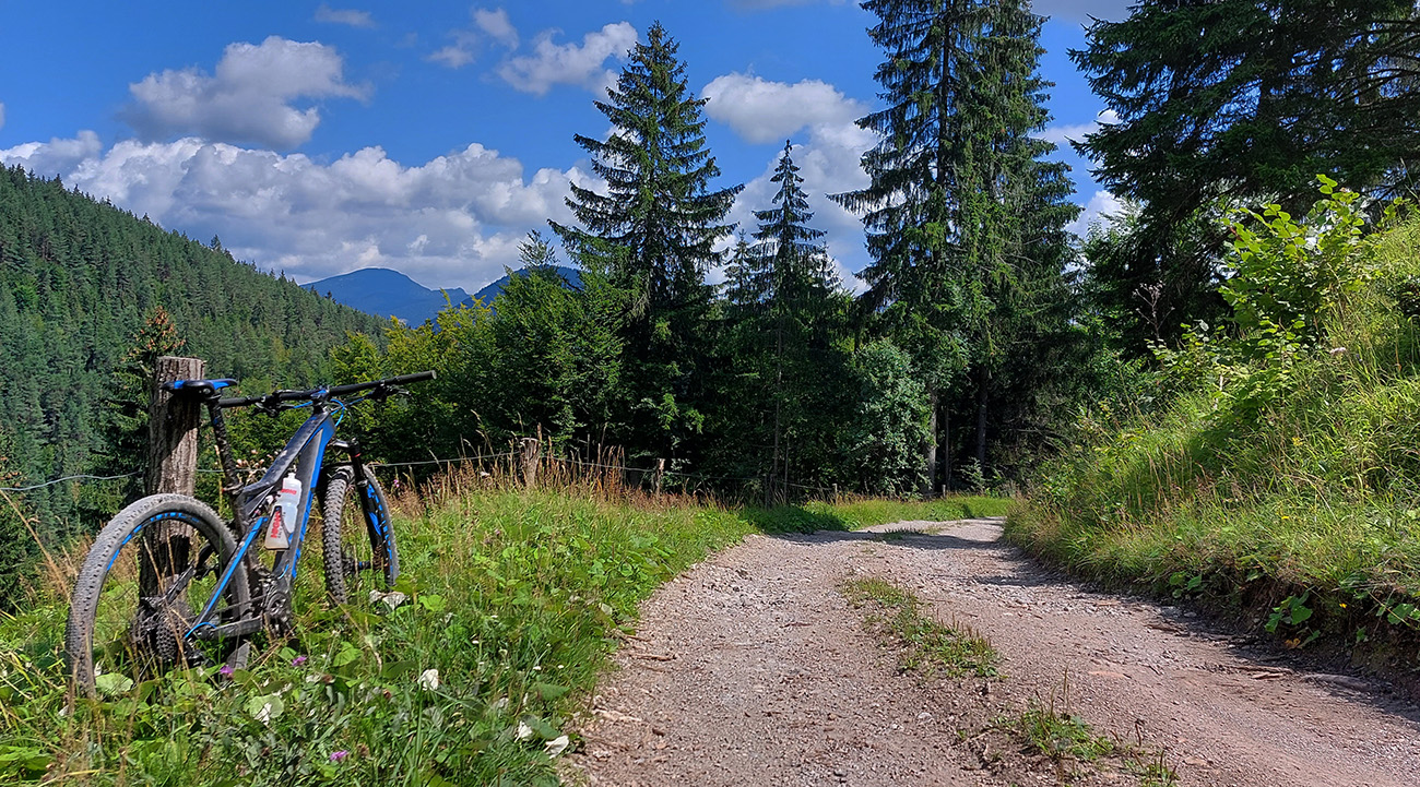 Na jar, keď som tu bol peši, išiel som doľava, tak teraz som skúsil doprava. Tam viac vlhka na severných svahoch, aj viac vody pod kolesami, takže trochu zarastenejšia, ale stále výborná cesta. Len asi po 500 m zrazu psssssssssssssssss! A už som obracal bajk hore bruchom a vymieňal dušu. Dáky tŕň či čo. Náhradnú som mal na ráme prilepenú a vrecká plné, takže po výmene išli dva banány do brucha a miesto nich tá deravá duša do dresu, lebo lepiacu pásku so sebou nenosím a ani batoh som nebral, veď civilizácia je tu všade blízko :-)