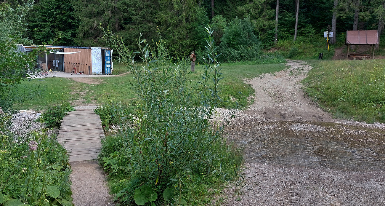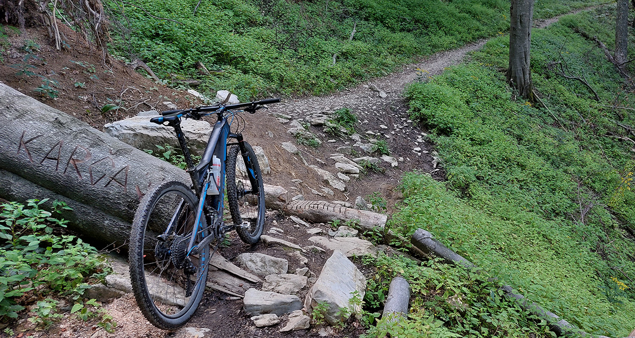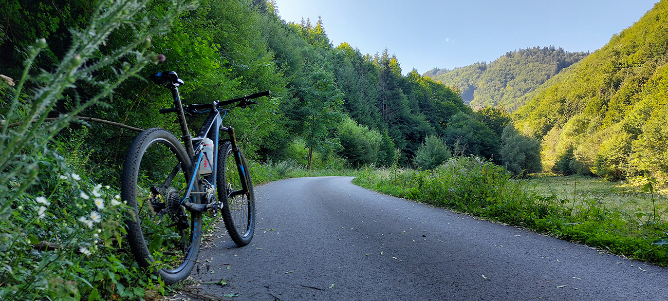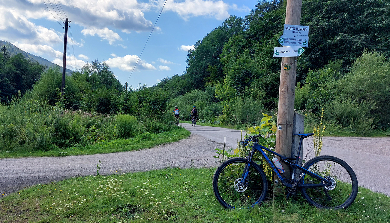 Zo sedla Príslop kratučký dolekopec na zvážnicu, ktorou sa dá dostať dole na dno Ľubochnianskej doliny. Najprv pár metrov pohodlne lesným priesekom, bajkeri poznajú, ešte aj šípka je na strome. Potom pár metrov strmo, ale jazditeľne. Pre istotu som ale zniesol, predsa len – veľké skaly, konáre, medzi nimi slizká hlina a ja biedny technik. Nikam som sa nehnal. Dole na ceste dve možnosti: doprava aj doľava. Obe ústia nižšie v bočnej dolinke, na starej asfaltke pri Tureckom potoku a k horárni Salatín je to potom už rýchly a rovný zjazd. Tu by sa pýtalo vyznačiť cyklotrasu, bolo by to parádne prepojenie Turca a Liptova.