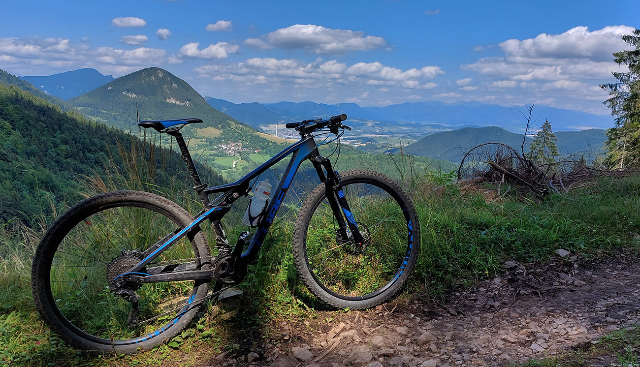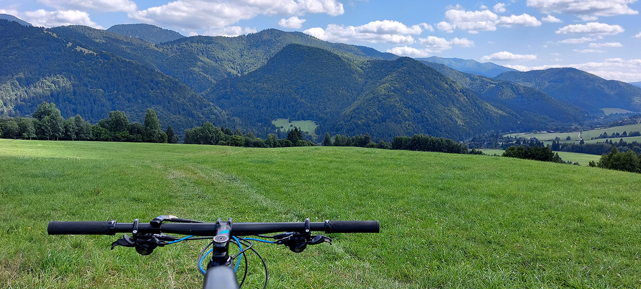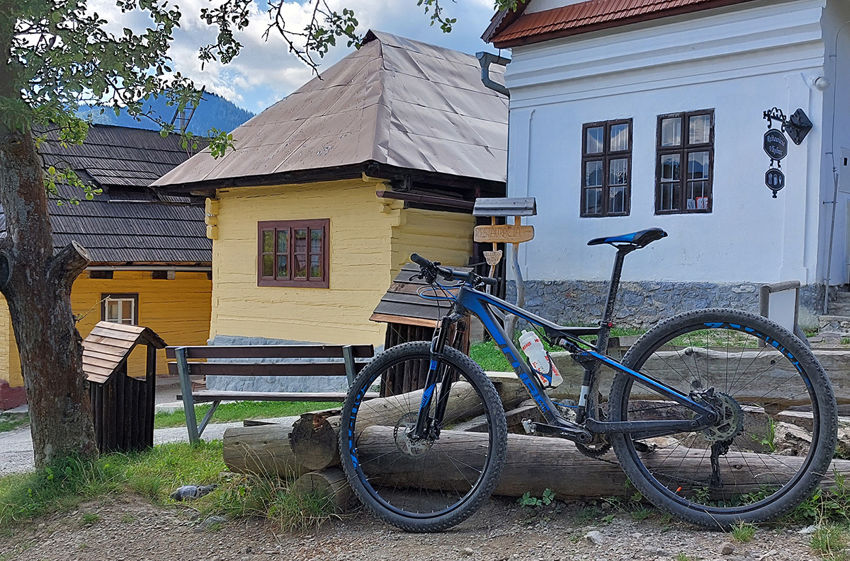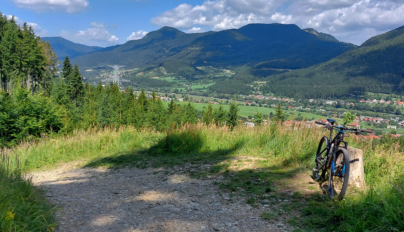 Možností je tam plno. Vybral som si krásny, aj keď trochu technickejší (lebo korene) výjazd popod Sidorovo až nad Vlkolínec, po singlíku „Rozprávkového endura“. Inak je to prednostne turistická značka, tak to chce vzájomný rešpekt. Hore na Vlkolínskych lúkach krásny výhľad: za mnou Haliny, predo mnou v diaľke Kozí chrbát a Prašivá, popod ktoré som dúfal ku koncu šliapať. Dole Vlkolínec, kam som zišiel radšej bočnou cestou, mimo značky. Tá je rozbitejšia a aj plná ľudí, zavadzal by som.