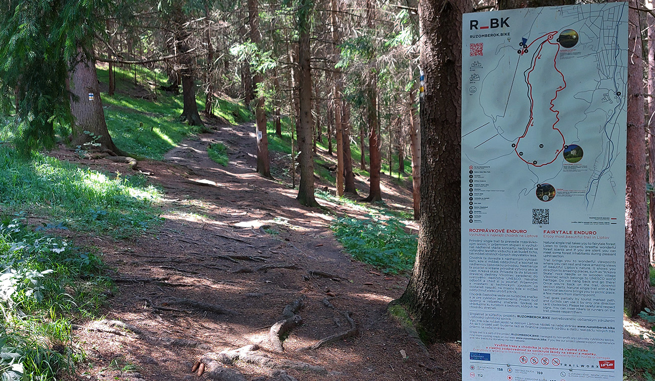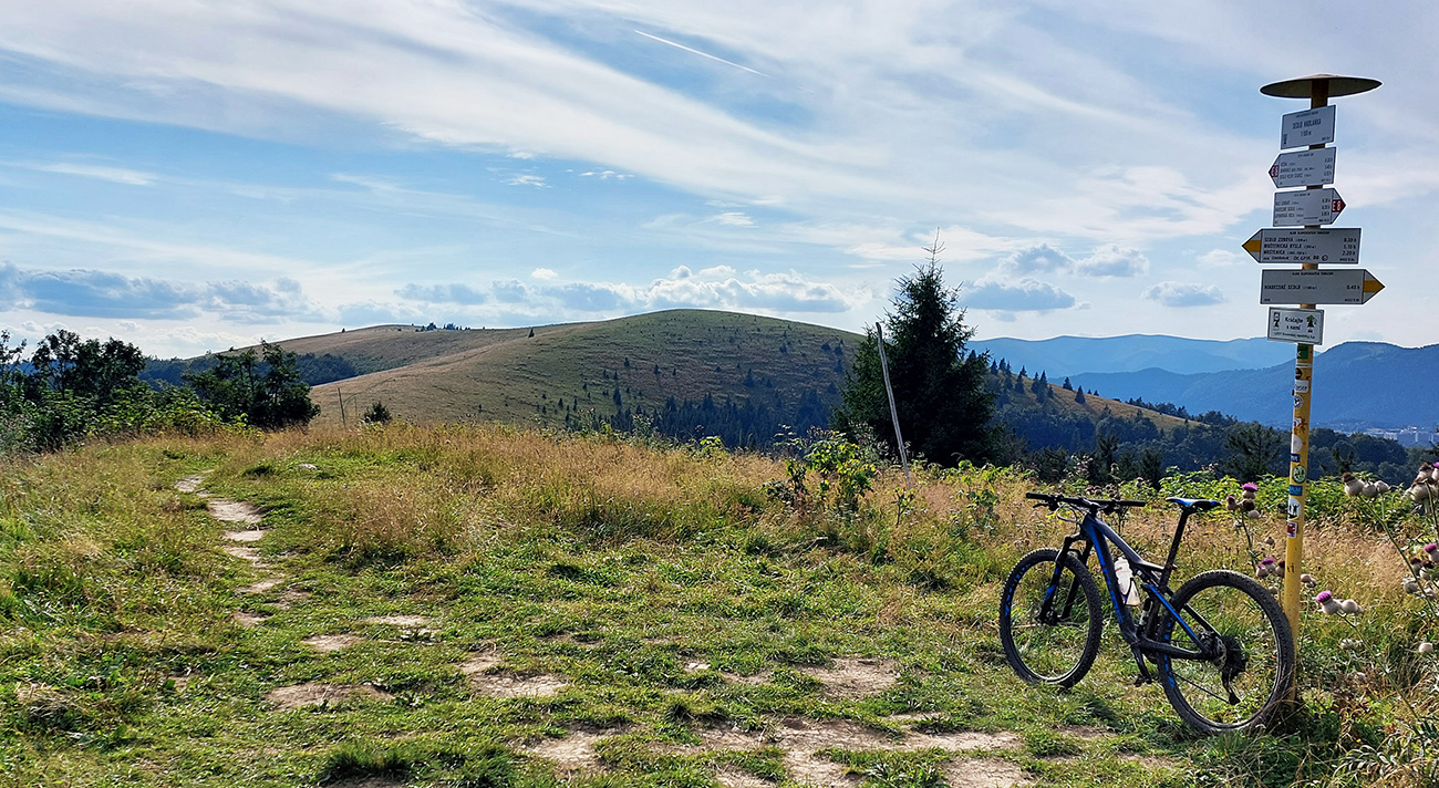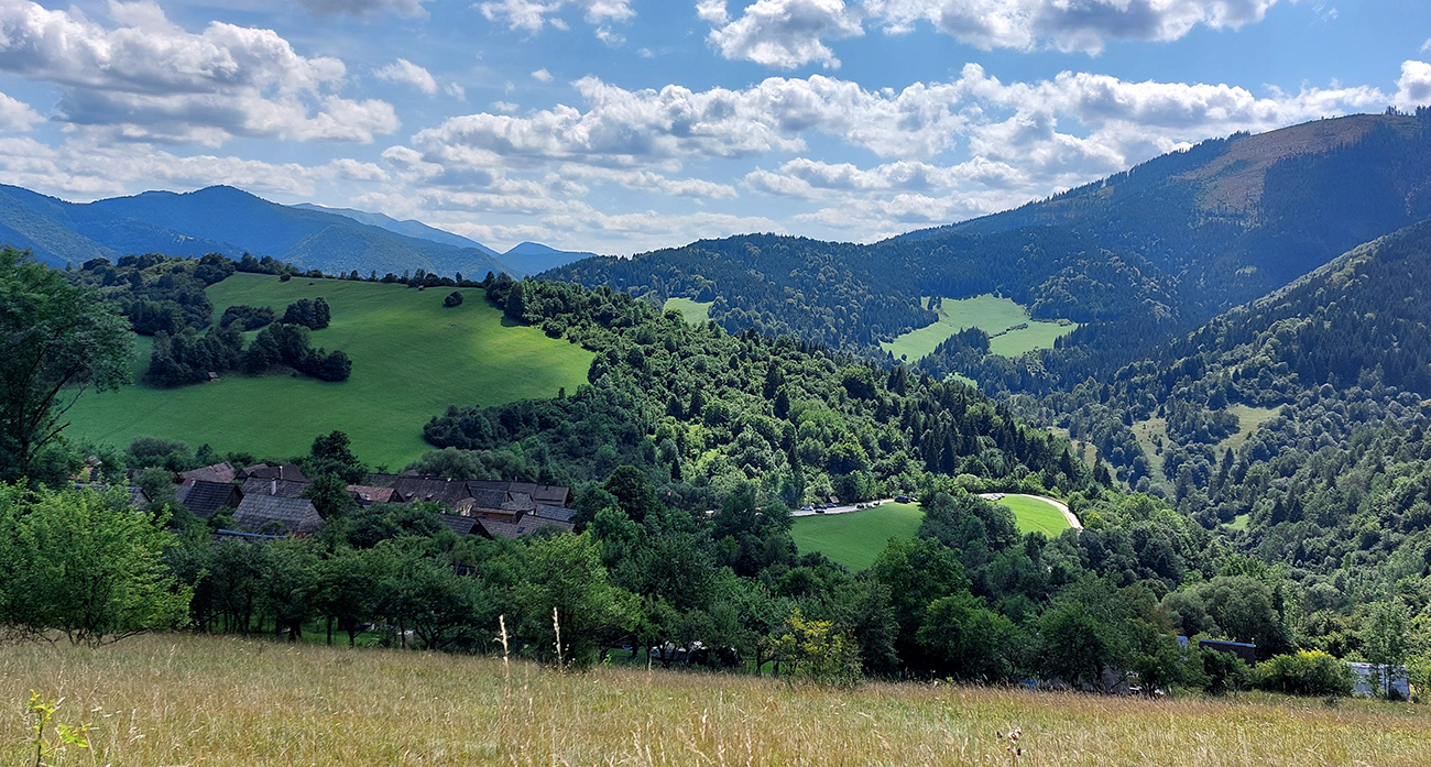 Možností je tam plno. Vybral som si krásny, aj keď trochu technickejší (lebo korene) výjazd popod Sidorovo až nad Vlkolínec, po singlíku „Rozprávkového endura“. Inak je to prednostne turistická značka, tak to chce vzájomný rešpekt. Hore na Vlkolínskych lúkach krásny výhľad: za mnou Haliny, predo mnou v diaľke Kozí chrbát a Prašivá, popod ktoré som dúfal ku koncu šliapať. Dole Vlkolínec, kam som zišiel radšej bočnou cestou, mimo značky. Tá je rozbitejšia a aj plná ľudí, zavadzal by som.