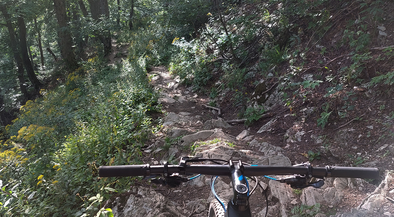 Traverz bol parádne preleštený účastníkmi Donovalského drapáku spred pár dní, ani taký veľmi blatnatý nebol, ako som ho mal zafixovaný. Najtechnickejšie to bolo po výjazde z lesa, kde je úzkosť chodníka kombinovaná s priečnymi koreňmi a vedie zarastajúcim okrajom lúky. Našťastie tam už sucho bolo. Cez Kečku potom samozrejme komfortný, hladký singlík na oddych aj na výhľady. Jeho úplný opak na záver - známy „bralnatý“ zošup k útulni som samozrejme zišiel na istotu popri bajku.