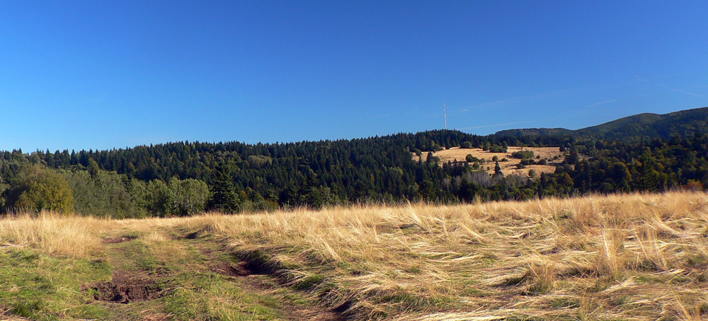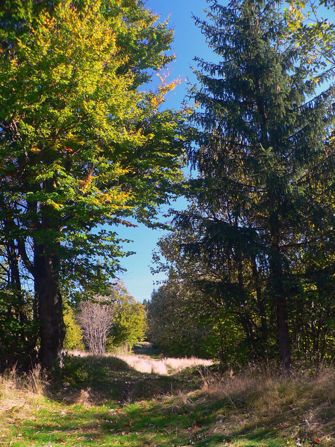 Cestou nazad sa otvára výhľad na opačnú stranu, dominuje mu vysielač na Skalke. Nasleduje dlhší úsek širokou lesnou cestou, čerstvo prečistenou a prepílenou. Hádam aby mohli mašiny v zime bežecké stopy ťahať?