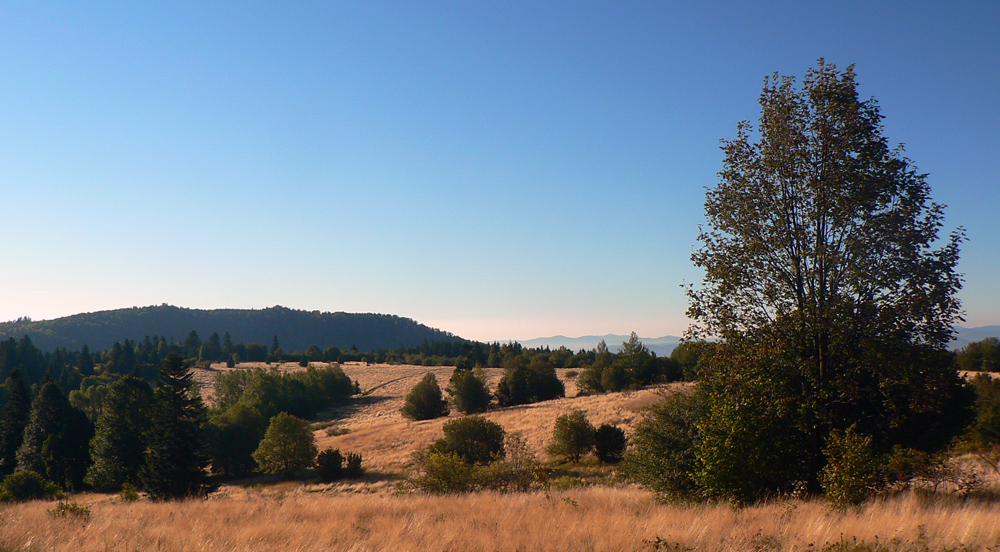 O 20 minút som nazad na žltej a valím si to jesenne farebnejúcimi pasienkami na Kremnický štít. Prečo štít, kto vie? Ale najmä je tu ďalšia odbočka do Nevoľného a zas ma stiahne, lebo kúsok nižšie je chata a prístrešok (vhodný aj na nocľah) s exkluzívnym výhľadom na hrebeň Vtáčnika, Štiavnické vrchy a komíny žiarskej hlinikárne. Zdola od útulne počuť chrapľavé nadávanie, to pastiera jalovice ani psiská nepočúvajú.