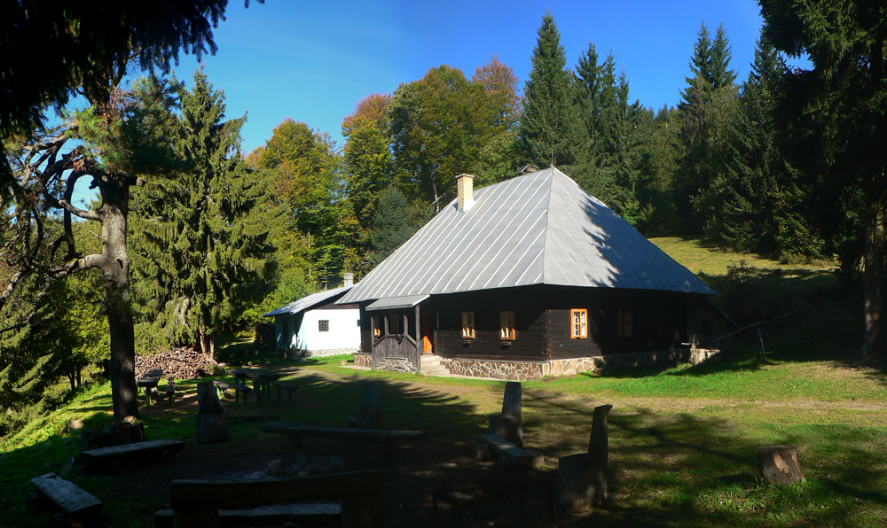Na Hostinci je veselo, veď je nedeľa - a pekná, septembrová. Hádam to babie leto konečne prišlo. Dnu nejdem, len si dám trocha vody „U raneného bojovníka“ a posúvam sa ďalej. Do sedla Tri kríže je to len štvrťhodinka, ale radšej idem obchádzkou cez Velestúr, ako by som sa mal trepať po zvážnici. Tam nie sú ani výhľady, spod Velestúra aspoň jeden vďaka rúbanisku - Skalka je z neho ako na dlani.
