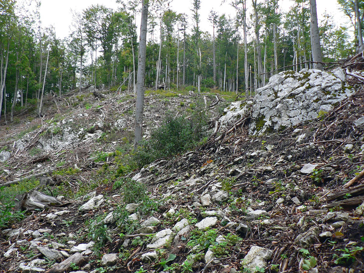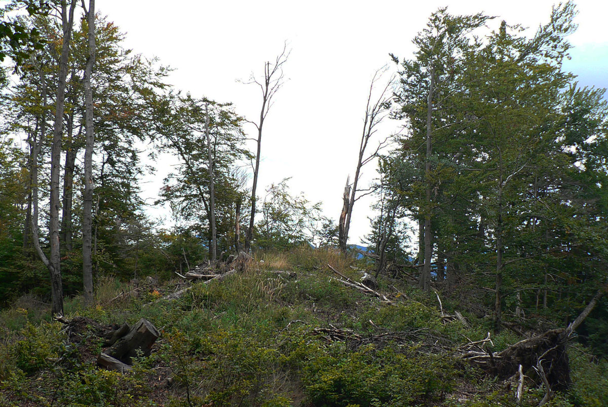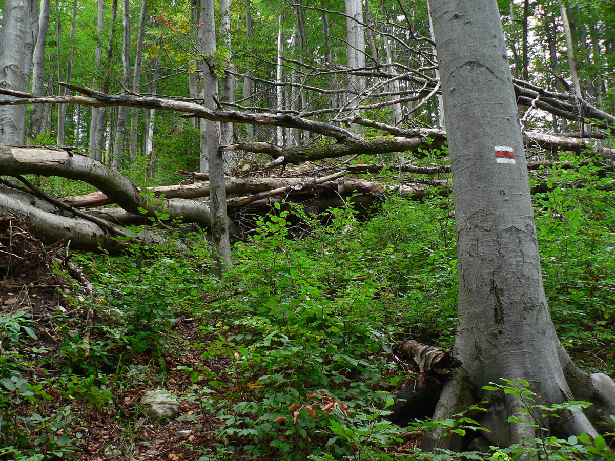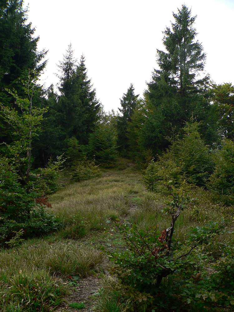 Z Kopy dole do Ľubochnianskeho sedla tiež nič moc. Podvrcholová lúka ponúka len obmedzené pohľady na hrebeň Veľkej Fatry a malý priehľad do Turca. Ale aj spoľahlivý prameň (aj koncom leta) na začiatku žltej značky. Naša červená, to je najprv prudký zošup lesným tunelom na zvážnicu, potom trochu rovinka na križovatku zvážnic a odtiaľ ďalšia, tentokrát poriadne rozbitá zvážnica „postkalamitnými“ rúbaniskami (zasa občasné priehľady do krajiny). Po krátkom stúpaní sa na chvíľu zmení na príjemný lesný chodník, vybehne na veľkú lúku a za stromami už vidno elektrické stožiare v sedle.