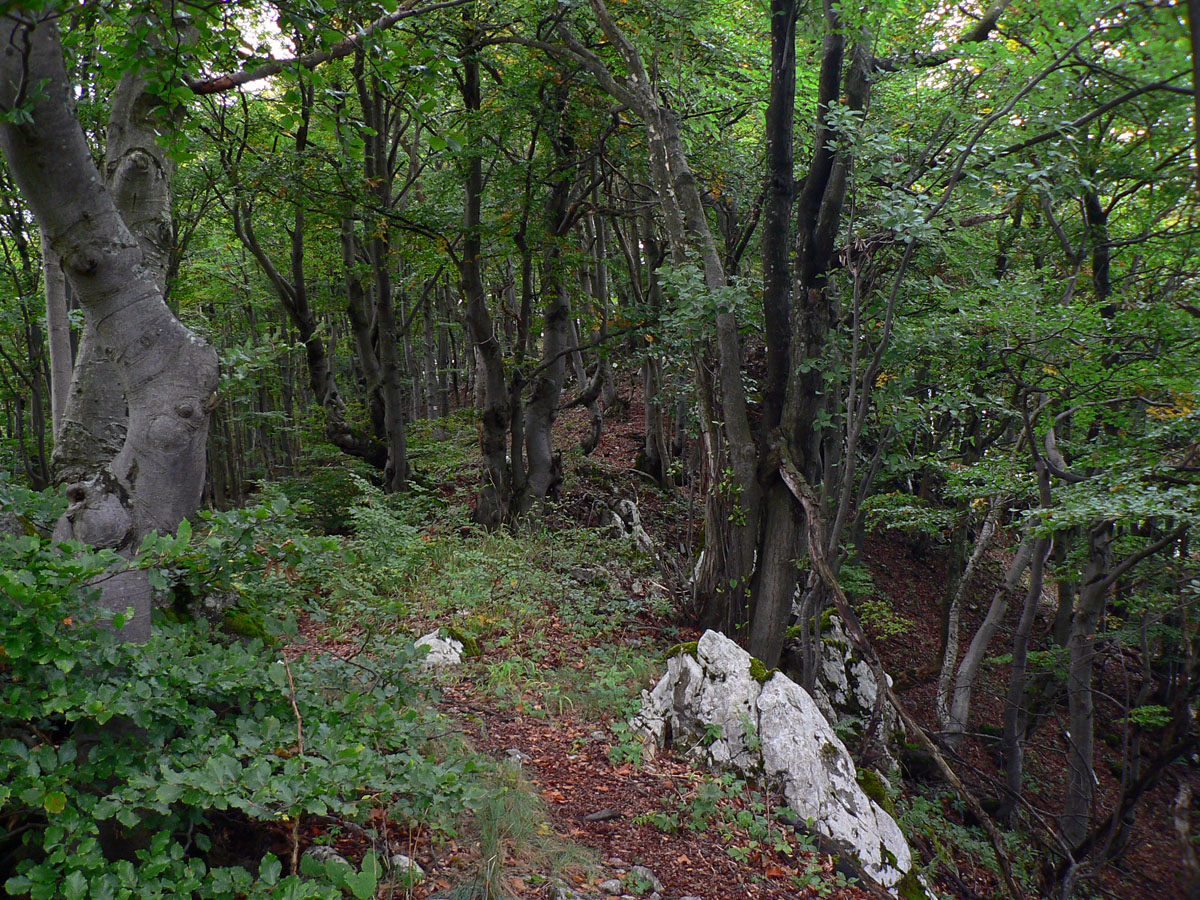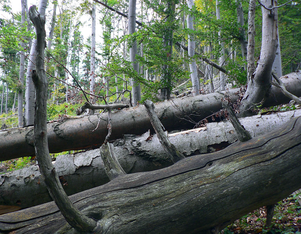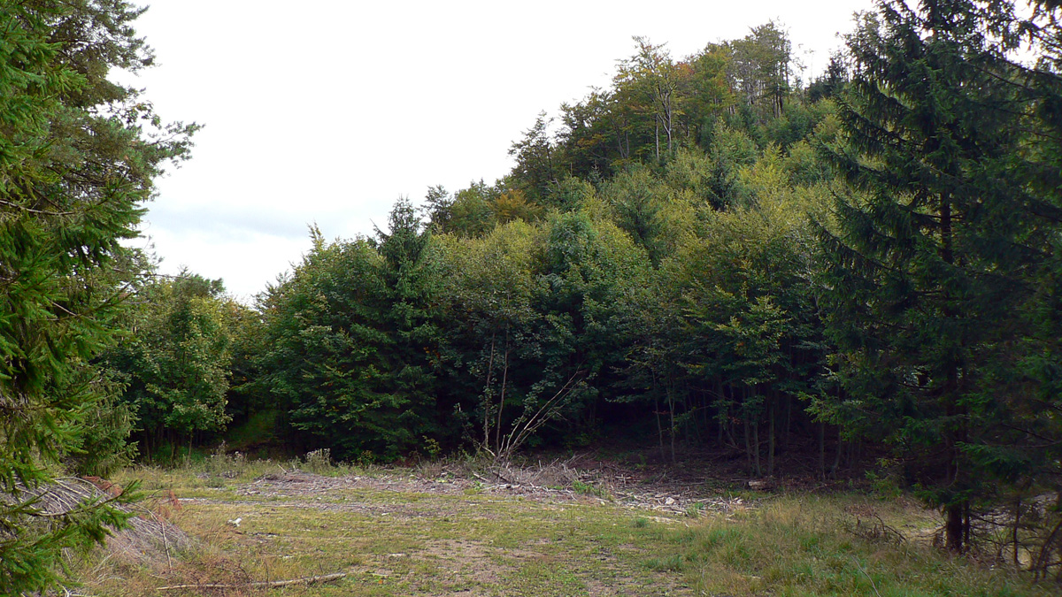 Z Kopy dole do Ľubochnianskeho sedla tiež nič moc. Podvrcholová lúka ponúka len obmedzené pohľady na hrebeň Veľkej Fatry a malý priehľad do Turca. Ale aj spoľahlivý prameň (aj koncom leta) na začiatku žltej značky. Naša červená, to je najprv prudký zošup lesným tunelom na zvážnicu, potom trochu rovinka na križovatku zvážnic a odtiaľ ďalšia, tentokrát poriadne rozbitá zvážnica „postkalamitnými“ rúbaniskami (zasa občasné priehľady do krajiny). Po krátkom stúpaní sa na chvíľu zmení na príjemný lesný chodník, vybehne na veľkú lúku a za stromami už vidno elektrické stožiare v sedle.
