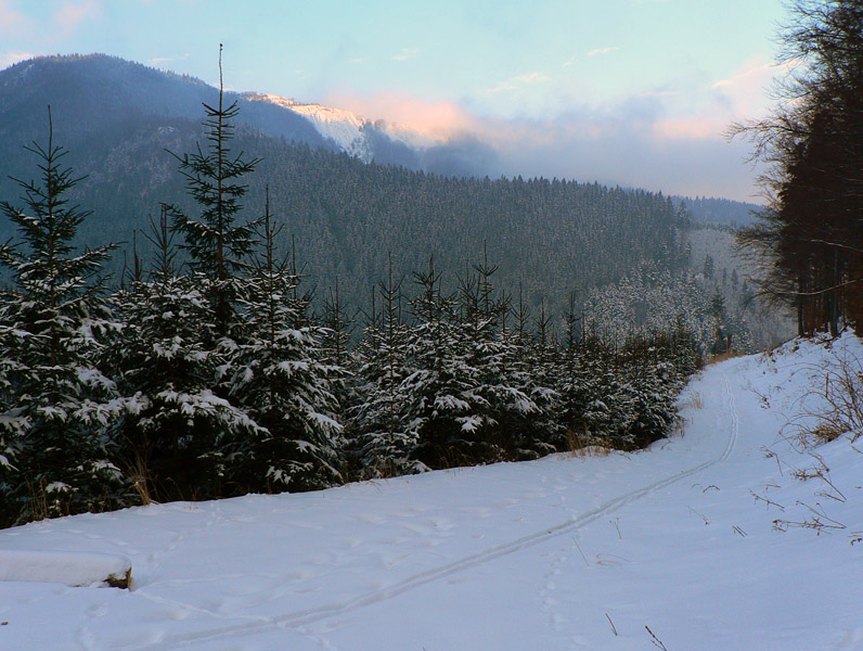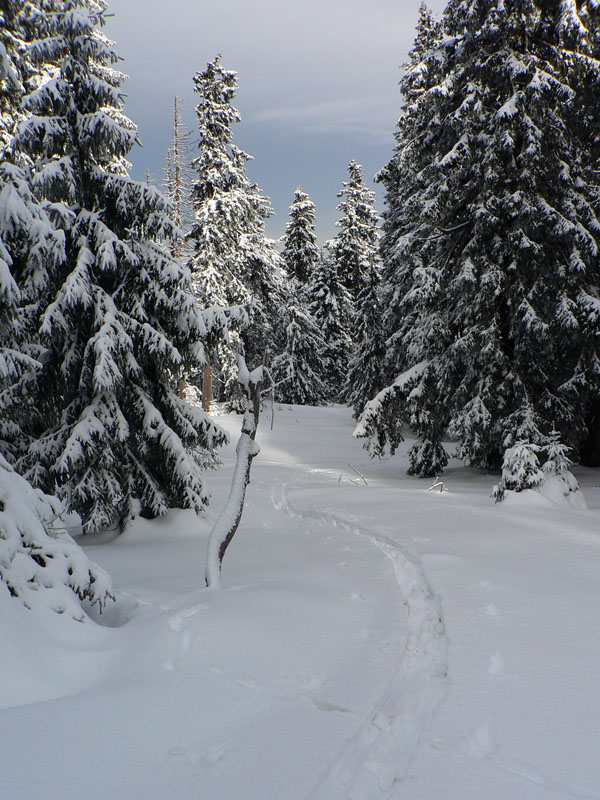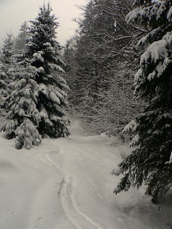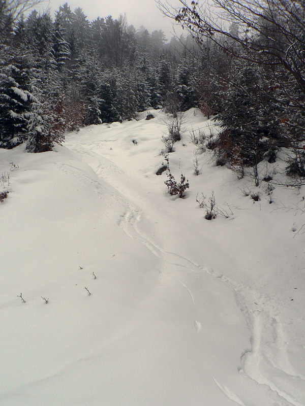 Medzi sedlami Rakytie a Javorina zasnežená zvážnica, len jedny zafúkané staré stopy, ale príliš na široko. Niekto šiel dolu na lyžiach. Čím vyššie, tým viac snehu, hore som dokonca rozmýšľal, že si zalyžujem lesom zo zvážnice na zvážnicu. Tam kde sa zvážnica a značka (a plynovod) v sedle Javorina točia do protismeru o takmer 180 stupňov. Ale odolal som, v lese sa to stále len tvárilo ako v tých frírajderských filmoch, ale nebolo to ono:-)