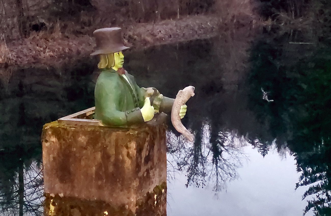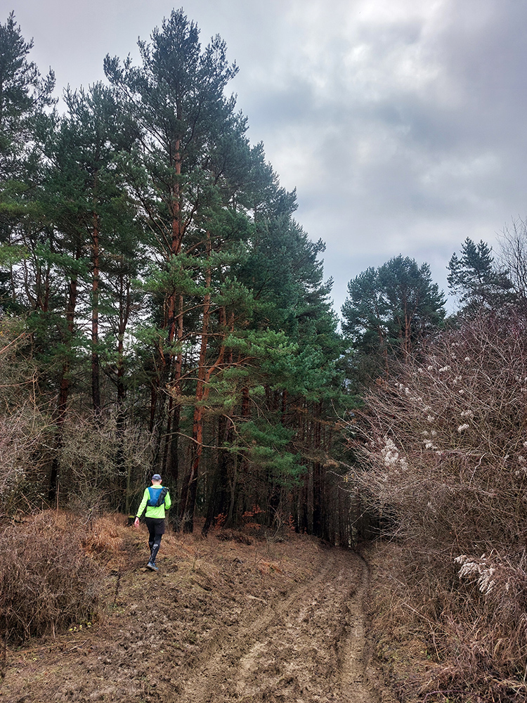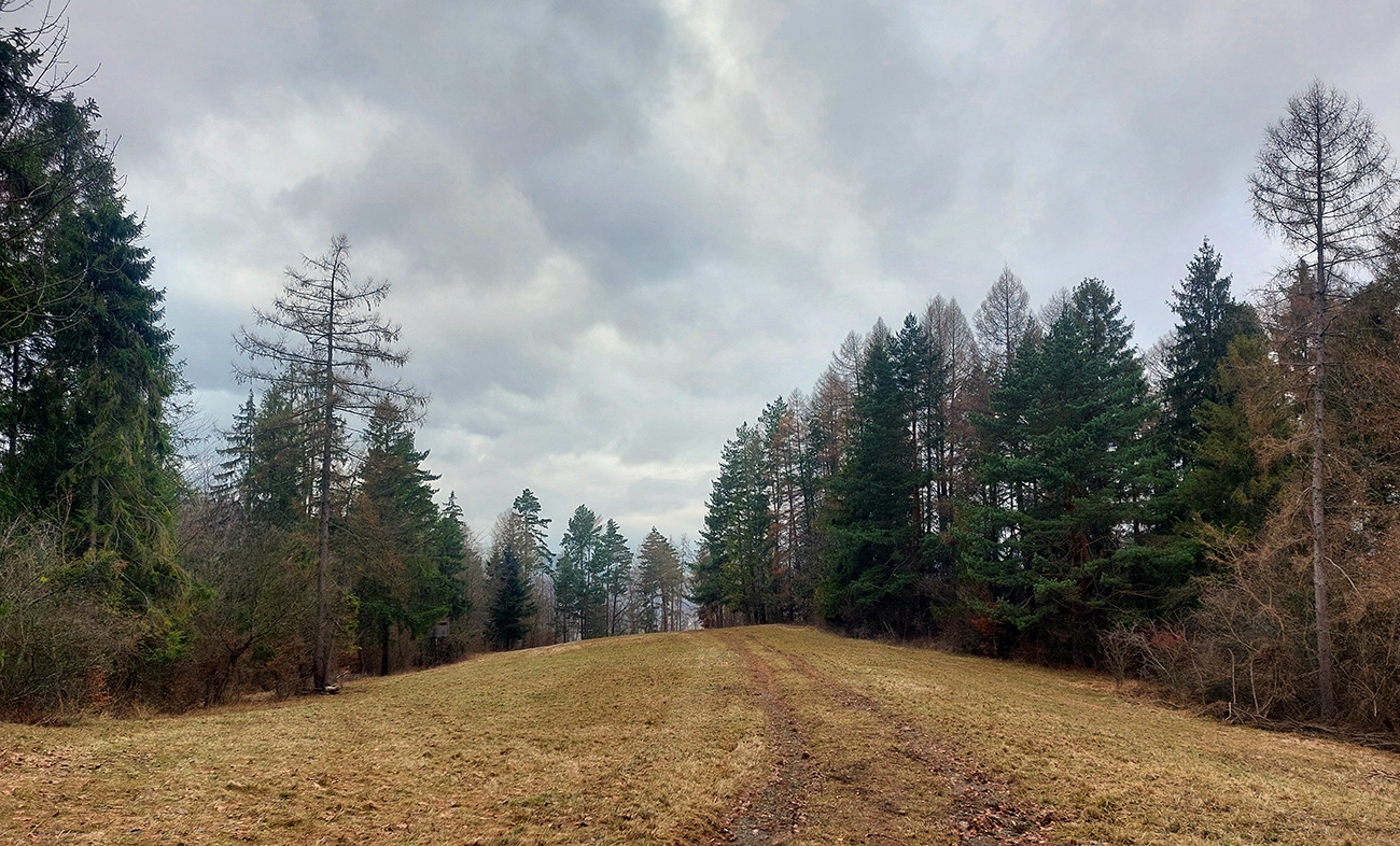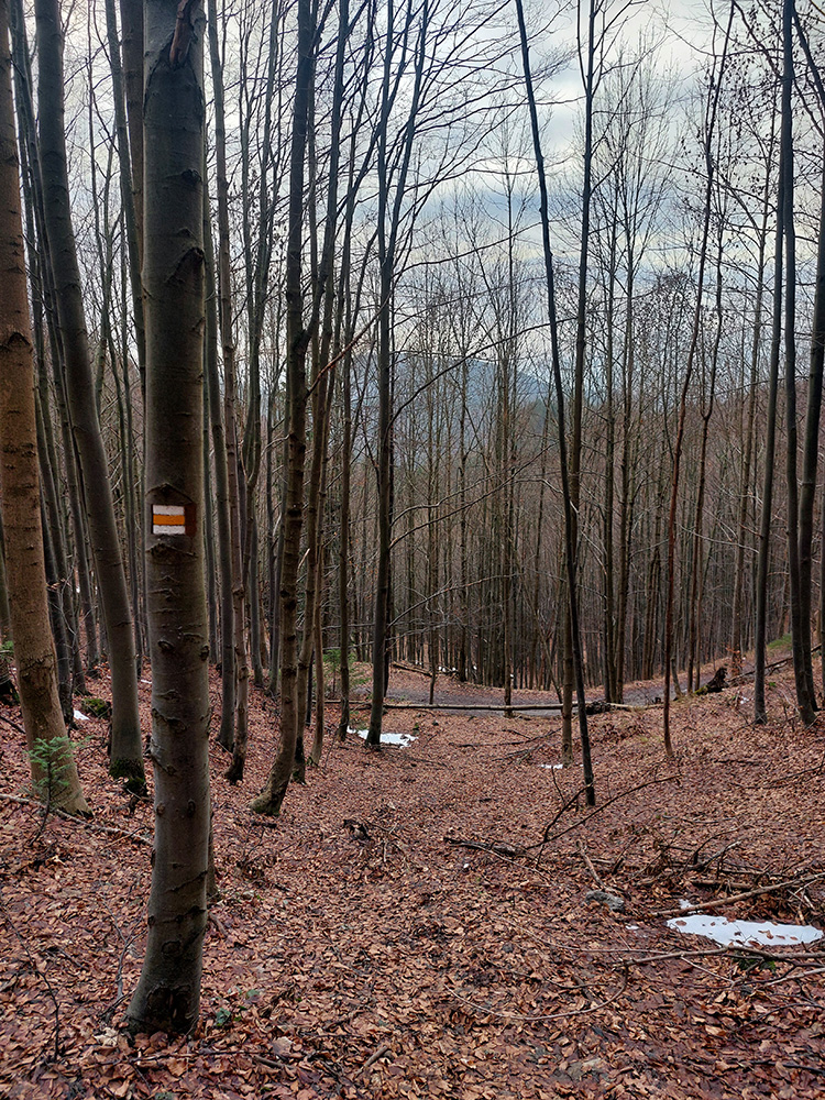 Tak zrýchlený presun dole kopcom k jazierkam Teplických serpentín, po neoficiálnych oranžových značkách, krížom cez rúbane, ale po relatívne jednoznačnom chodníku. Na vyhliadku ku krížu som už ani nešiel, stmievalo sa akosi moc rýchlo pod tou sivou dekou.