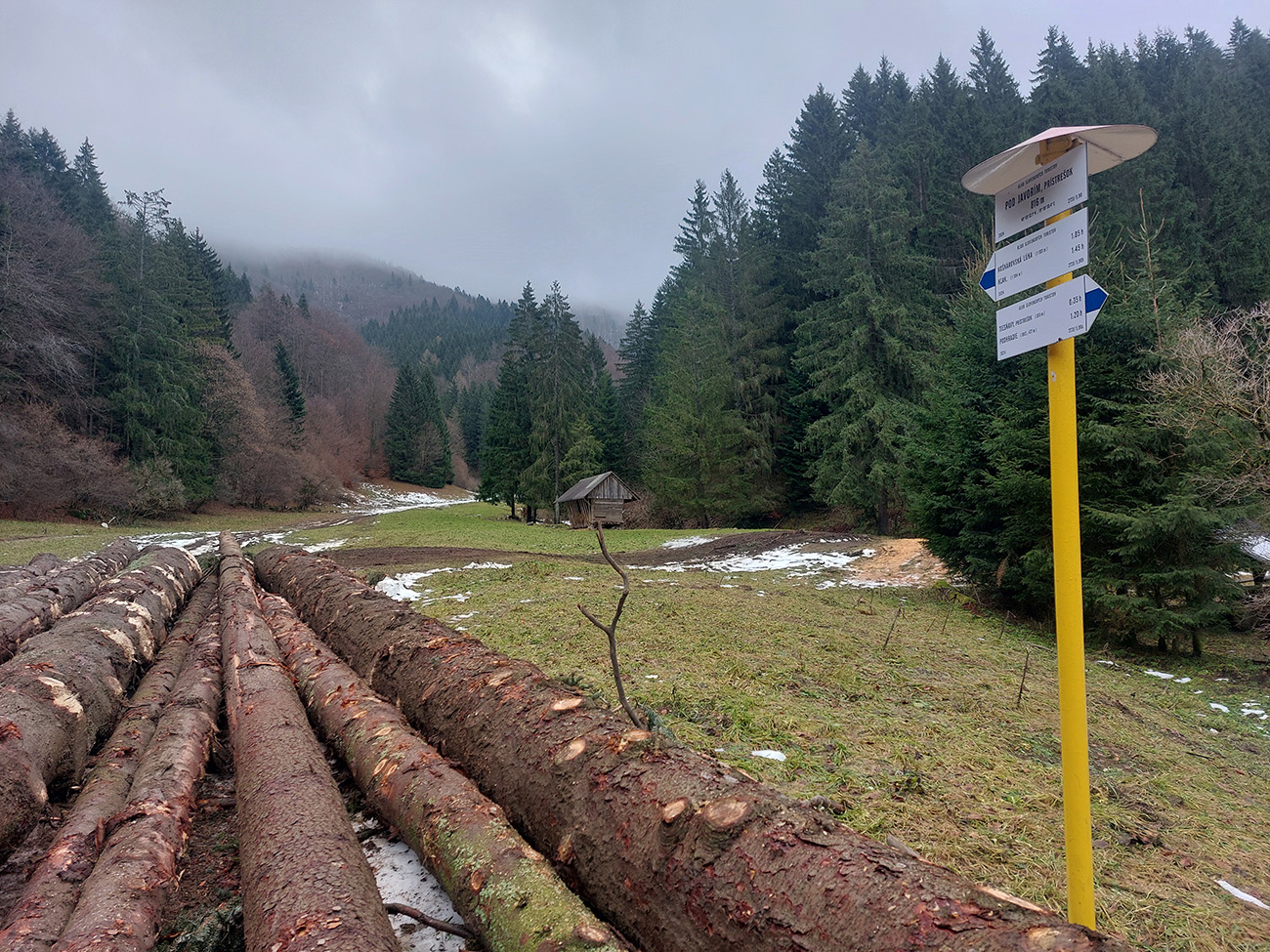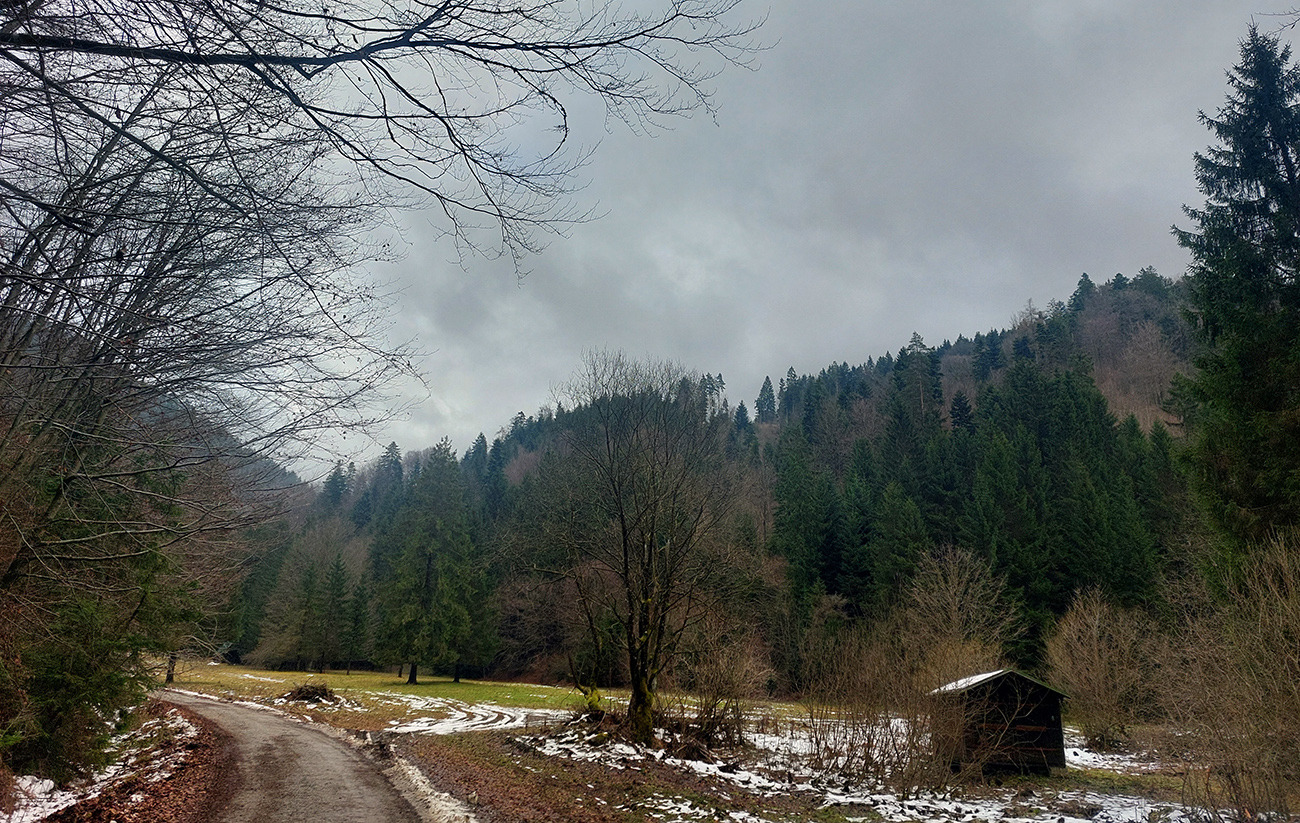 Nad dedinou som zatočil doľava a zbehol do Hlavnej doliny. Jednoduchý, čoraz strmší výstup po modrej na Koškárovkú lúku pod Kľakom. Najprv čistý asfalt a romantikuš zákutia, potom bahno riedke, bahno husté, občas traktor a v strmom závere mokrý sneh. Čiže na najvyššom bode trasy s relatívne čistými aj ľahkými, len už trochu čvachtajúcimi botami.