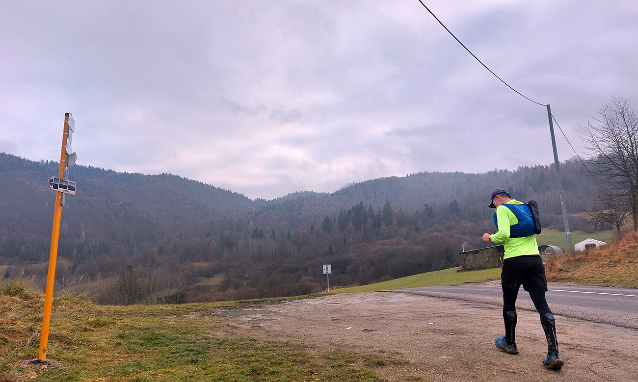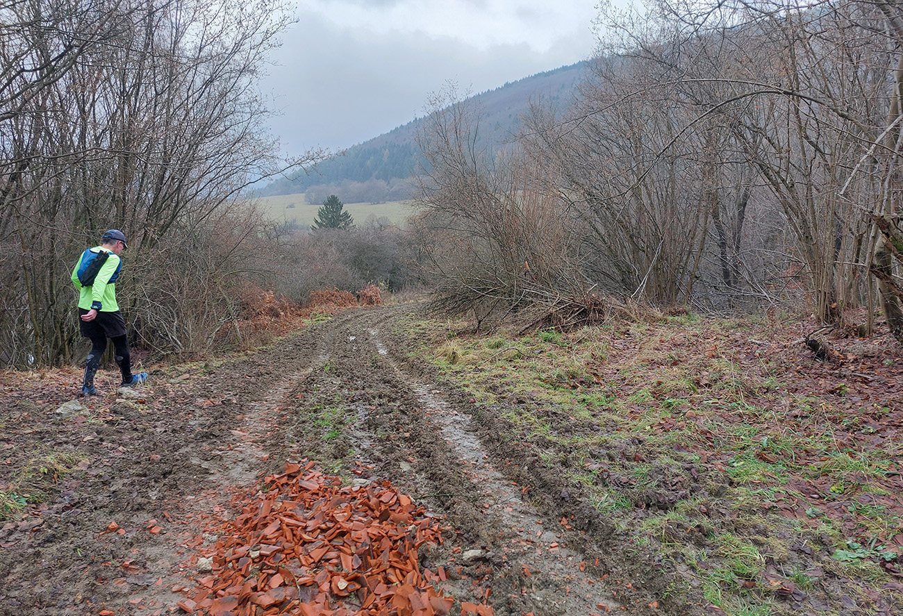Na úvod som pribalil Maja, ktorý dostal priepustku len doobeda a na môj údiv tú peknú cestu na Bieličie od Sučian nepoznal. Čo je to za domorodca? Niet divu, že ma najprv vliekol cez nejaké kompostovisko, kde také blato, aké sme na začiatku ešte neakceptovali, tak davaj nazad a po lúkach. Cez Bieličie pohoda a výhľady len do sivoty. Potom poza salaš do ústia Konštianskej doliny blato ešte horšie, len už nevyhnuteľné. Tam nad Konským sme sa navzájom opustili.