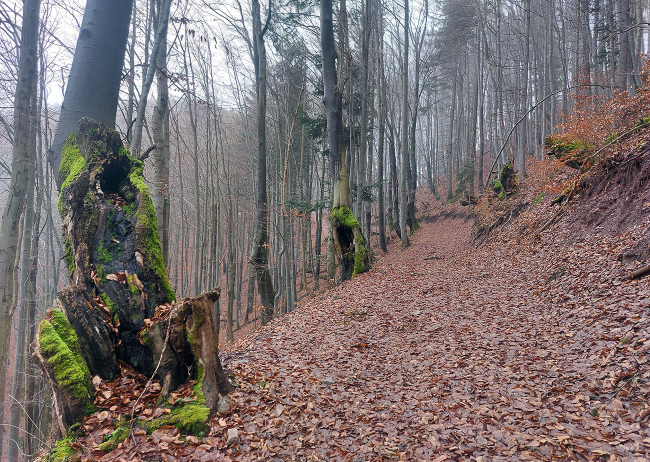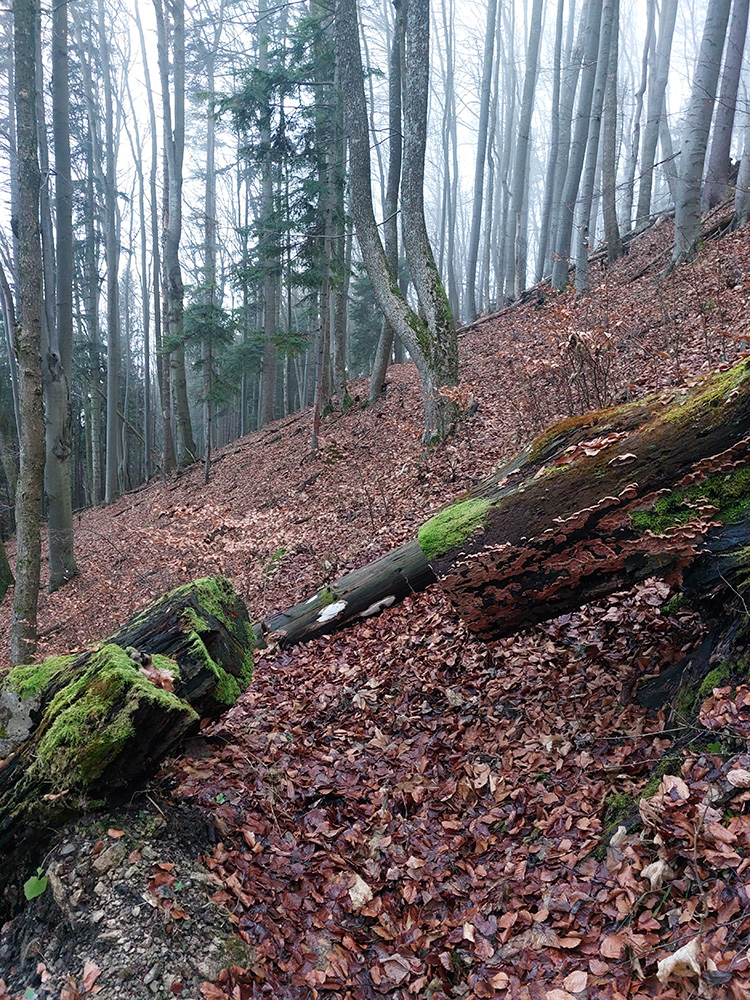 Južný obchvat Prieložnice, to bol ten najkrajší úsek – úzky, lístím zapadnutý, ale jednoznačný singlík takmer po vrstevnici, popod bralá. Ako som si jedno fotil, ani by som nebol zbadal, že ma pán domáci pozoruje. Až keď urazene sfučal a otočil sa mi chrbtom. Tak som sa stihol len ospravedlniť za vyrušovanie a pobrali sme sa každý svojou cestou, našťastie každý inou :-)