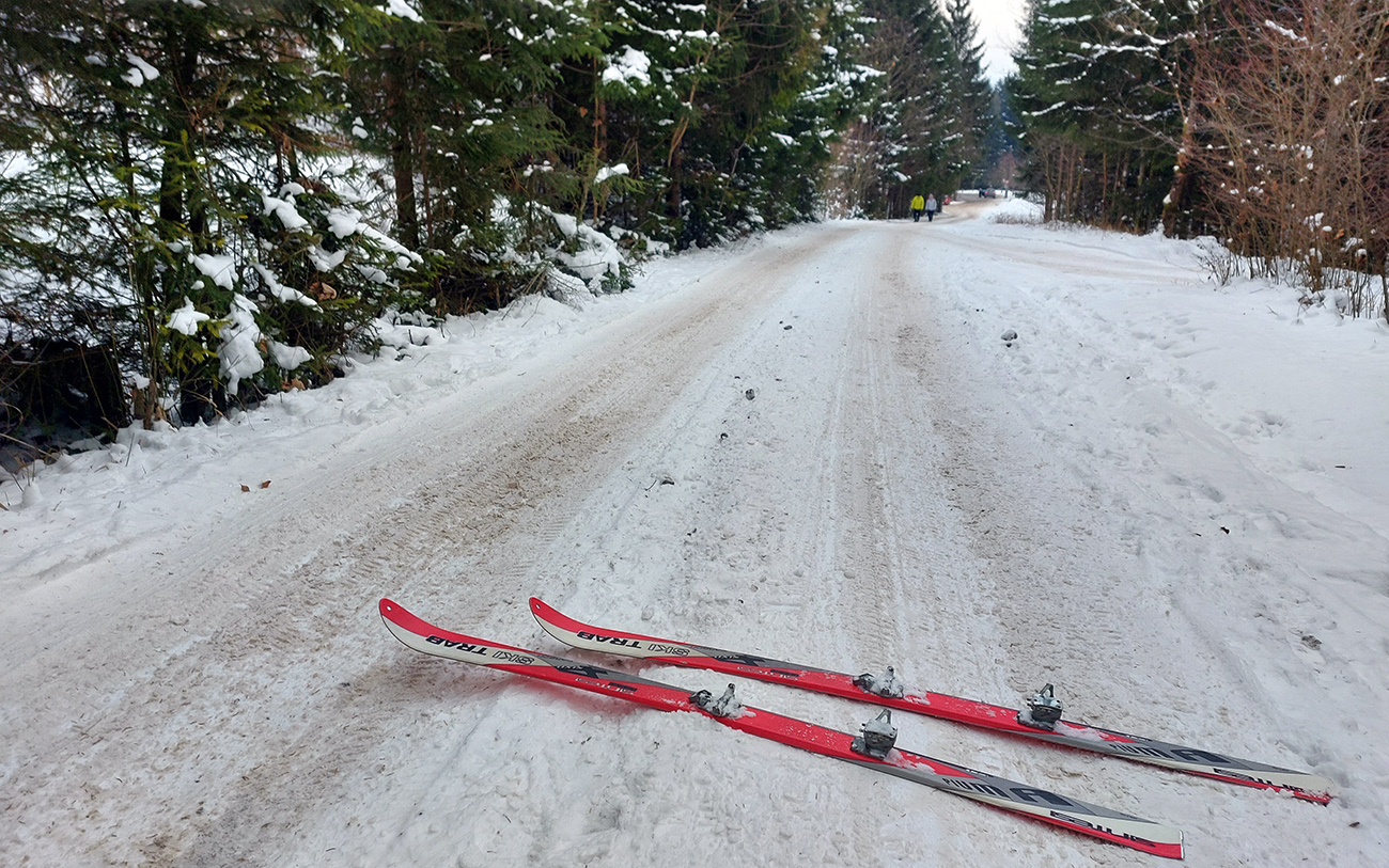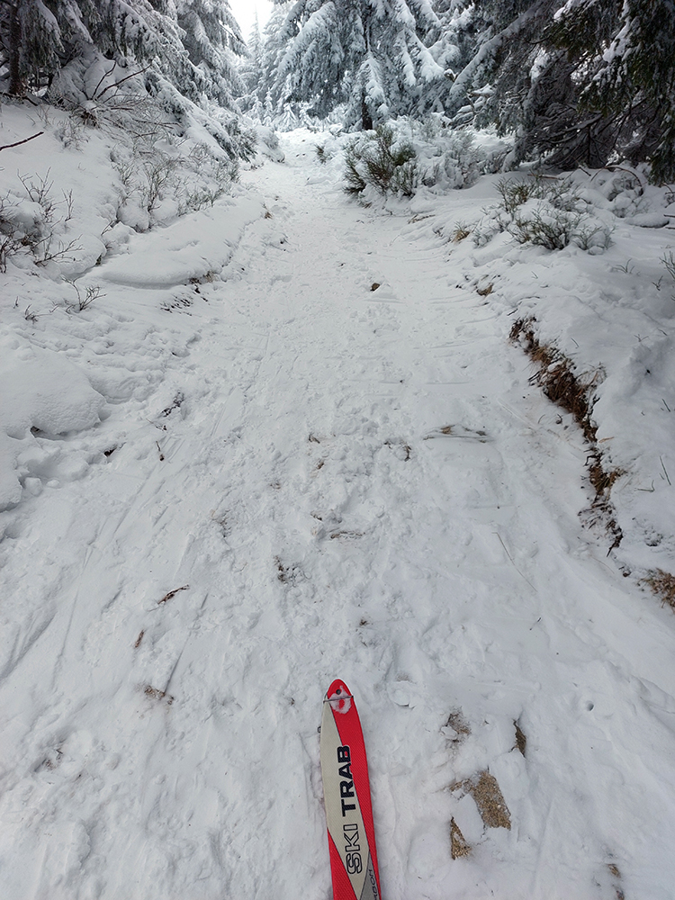 A potom už len dole – v podstate až k cintorínu na „Kolónke“. Prenášal som len kúsok v strmej skratke pod delom a okolo tých piraní nad rampou. Rovinky na Medvedej ceste som potlačil a prekorčuľoval, rovnako ako krátke stúpanie na investičke pred krmelcom. Na tú biedu skoro by som povedal, že paráda. Ale nech už sakra pripadne :-)))