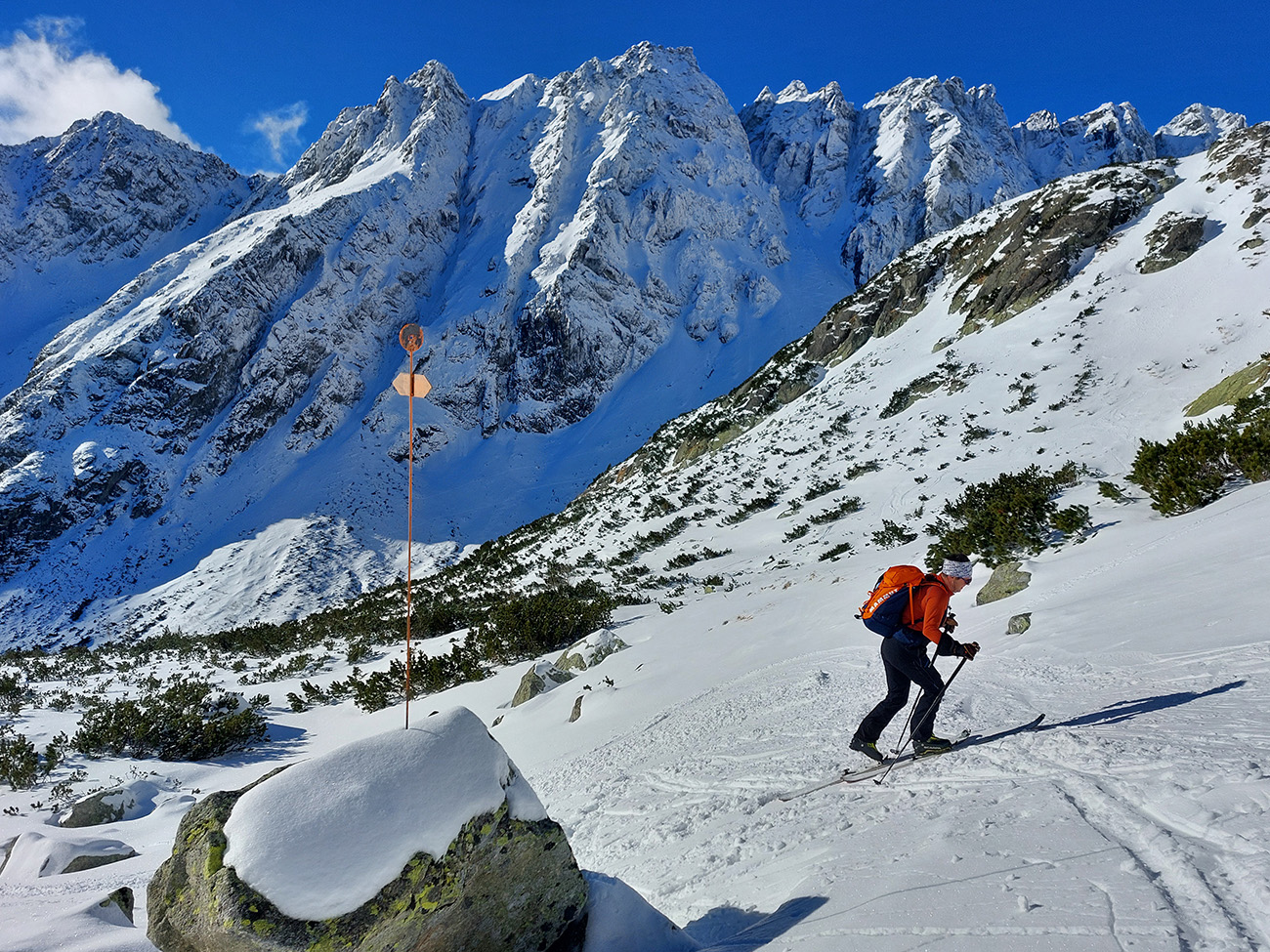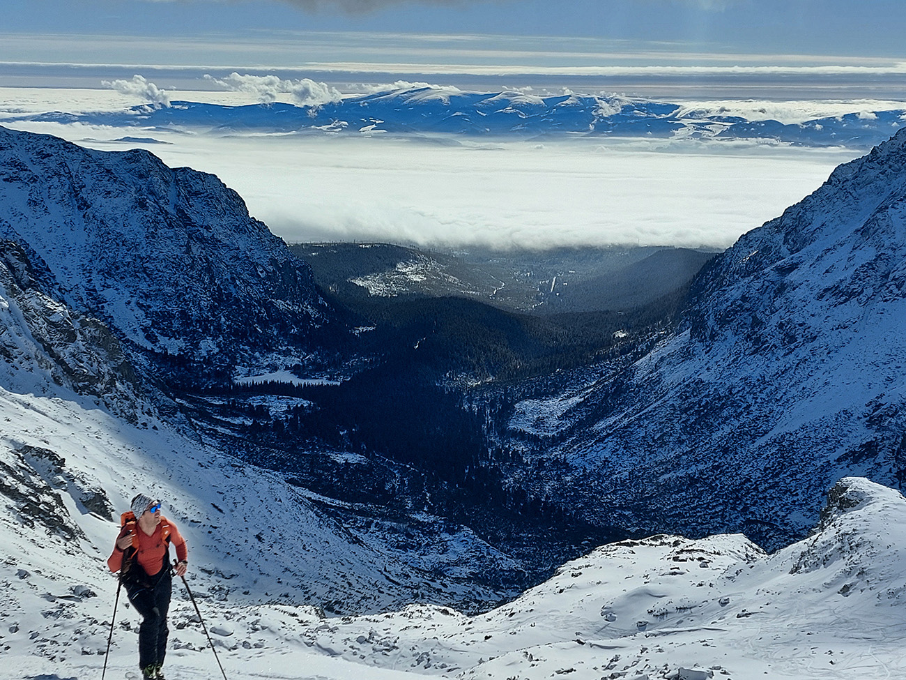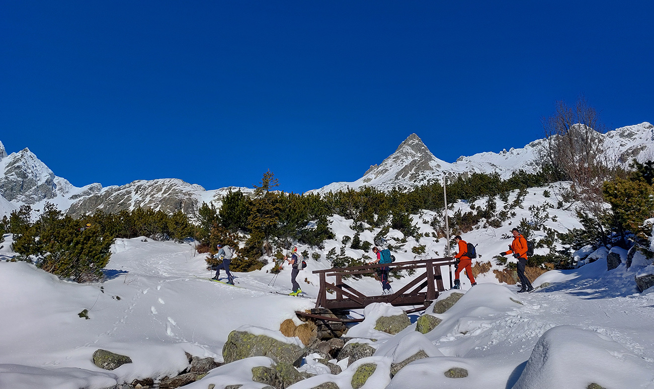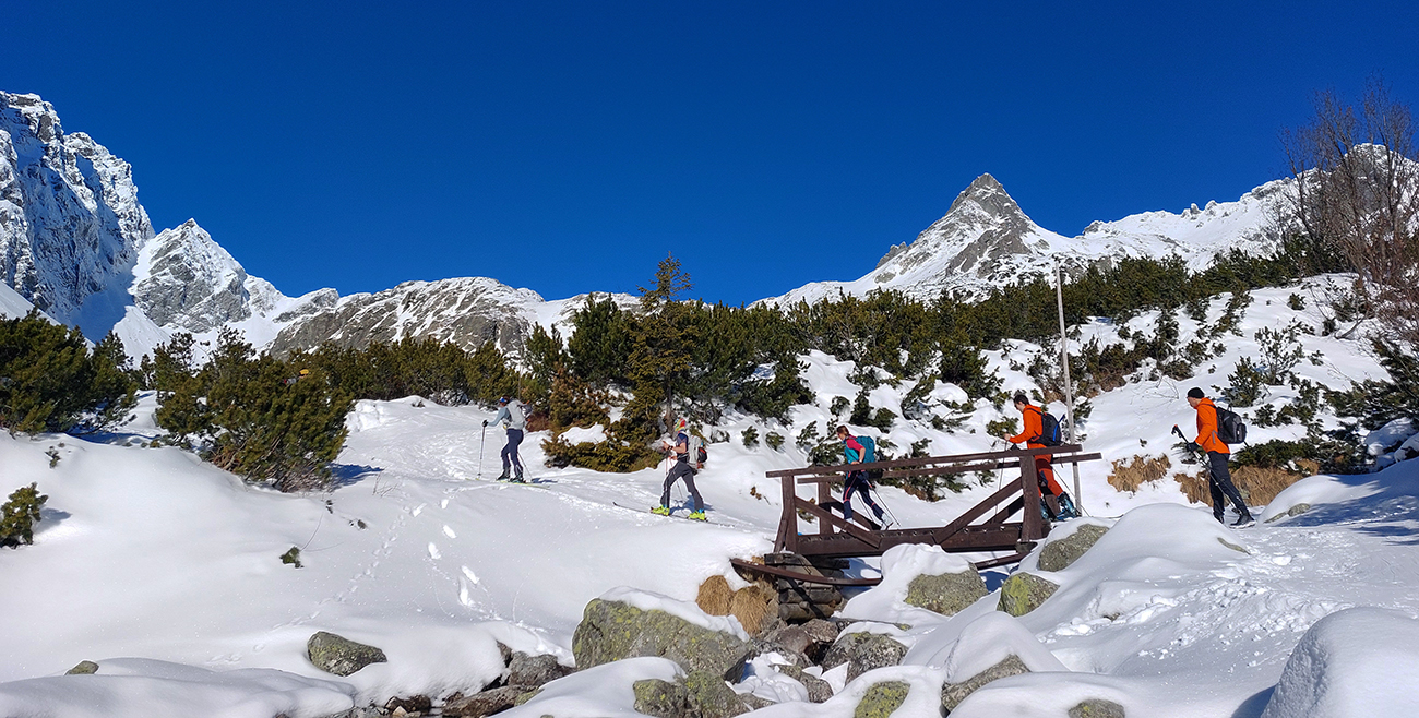 Podľa mnohých zdrojov vraj jedna z najkrajších tatranských skialpových túr. Navyše v takom počasí, aké sa tu koncom januára často nevyskytuje: jasno, bez vetra, s teplotou jemne pod nulou. Dole v kotline vysoko nastlaná inverzná perina, vyliezli sme nad ňu až nad Štrbou - Lieskovcom. Jednoducho v posledný deň januára sa spravilo také okno v sivote, že ažžžž. Takže nebolo čo váhať a neboli sme samozrejme sami: od zastávky Popradské pleso hore lesom od vodárne, cez potok a len kúsoček po ceste. Mengusovskou dolinou po Rázcestie nad Žabím potokom a odtiaľ doprava po pláňach, popri meteostanici pri Vyšnom Žabom plese do Volej kotliny a do finále hore na hrebeň. Otočka na „granici państwa“ v Nižnej Hincovej priehybe, pod dohľadom Západného Volieho rohu. Koniec miestopisného úvodu, dole rovnako, akurát od PP po ceste, samozrejme. GPX je hore, takto sme ťapkali: