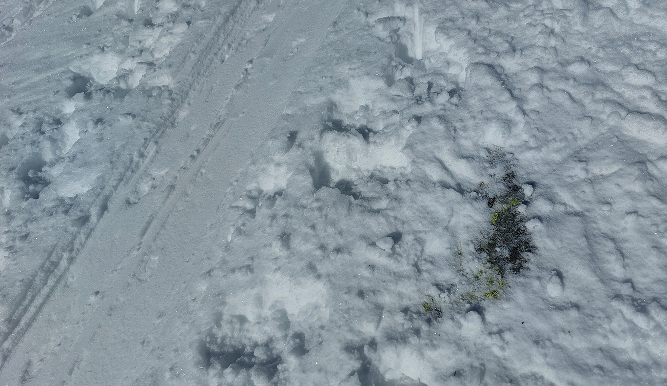 Sneh: na starom, zmrznutom podklade dobre prilepená tenká vrstva nového, na slnku už aj miestami zvlhnutého, tak to aj na strmších miestach pekne pod lyžami držalo: