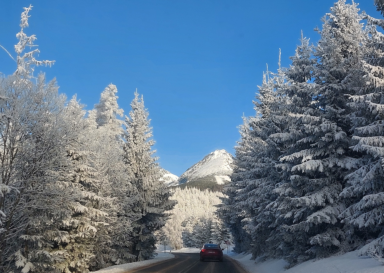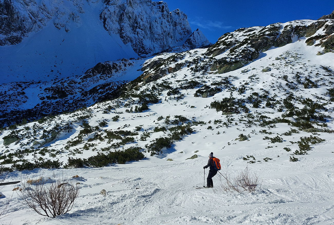 A to je skoro všetko, lebo k Popradskému už to išlo samo, a lepšie ako sme čakali cestou hore. Dalo sa všetko ubrzdiť alebo obísť. Aj cesta v pohode, až na záver, obrátený proti slnku, kvalitne odpluhovaný (snehové hrče na okrajoch) a vytopený na asfalt. Niekde ledva pásik na sklz po jednej lyži. Viacerí radšej vyzúvali, ale aj to sa dalo obkľučkovať cez kríky povedľa.