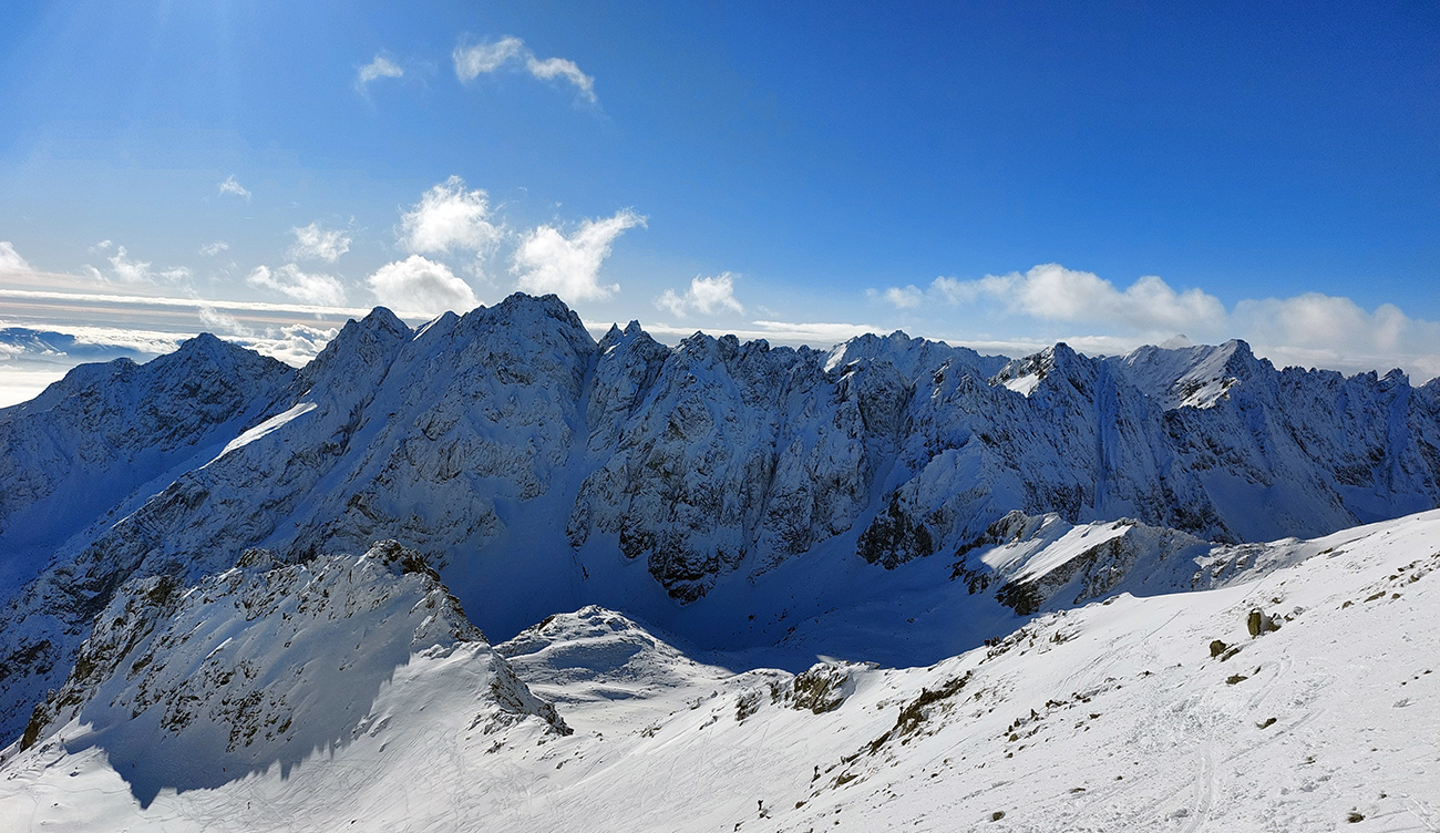 Vstup do Mengusovskej tiež snehová tragédia (zvykáme si, čo už), ale po ujazdenom a primrznutom to hore nevadilo a potom dole sa to tiež dalo risknúť a aj ubrzdiť alebo obísť, kde bolo treba. No hlavne – začali sa otvárať výhľady, ako tento na hrebeň Bášt: