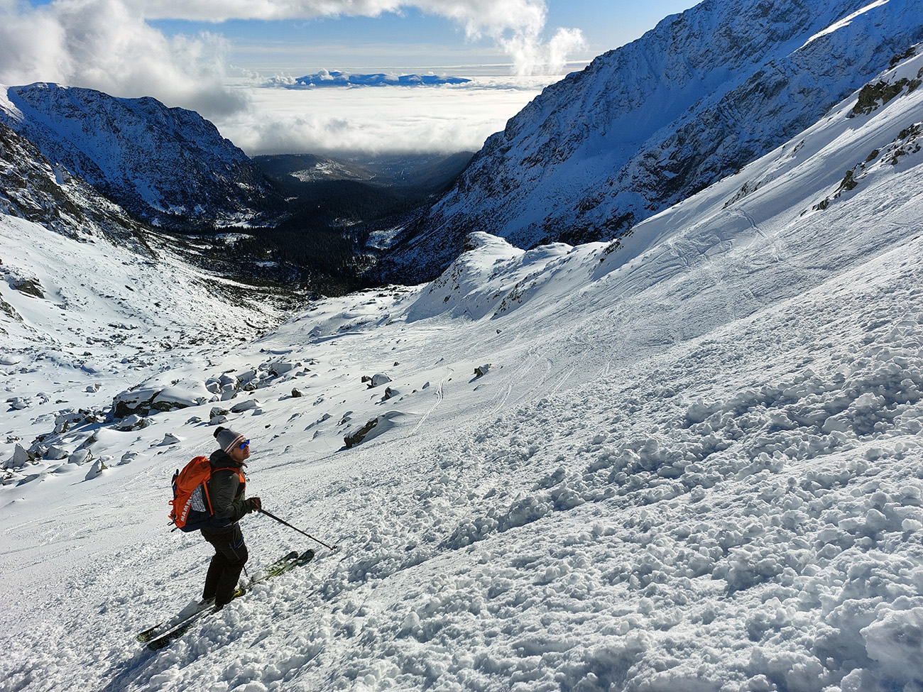 To už sme sa cez strmšie hangy a popri meteostanici prepracovali do Volej kotliny a išlo a do finále. Dno vyzeralo byť bezpečne vysnežené, tak sme sa aj poobzerať mohli – doprava dozadu na Ťažký štít napríklad: