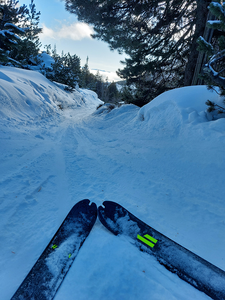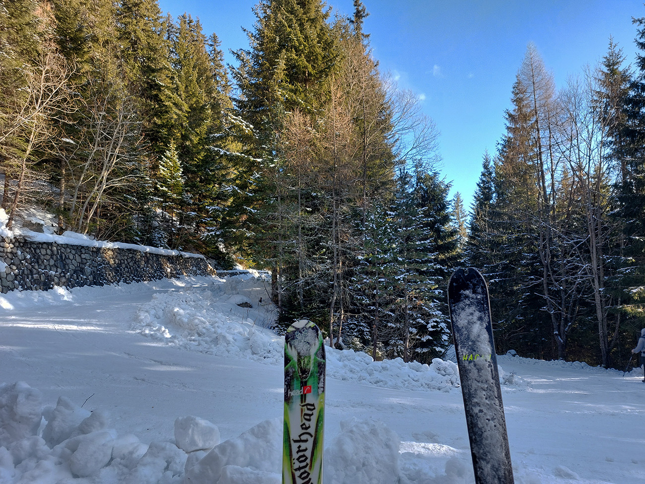 Nebolo sa kam náhliť, pohodička akurát taká poludňajšia, ale zas aby nohy nestuhli, začali sme sa tiež po chvíli dole spúšťať. Napriek opatrnosti v úvodnom strmom svahu nejaké tie škrtance zazneli, ale nič tragické. Potom už lepšie a dole v kosovke už zákruty preleštené, čiže zákernosti viditeľné.