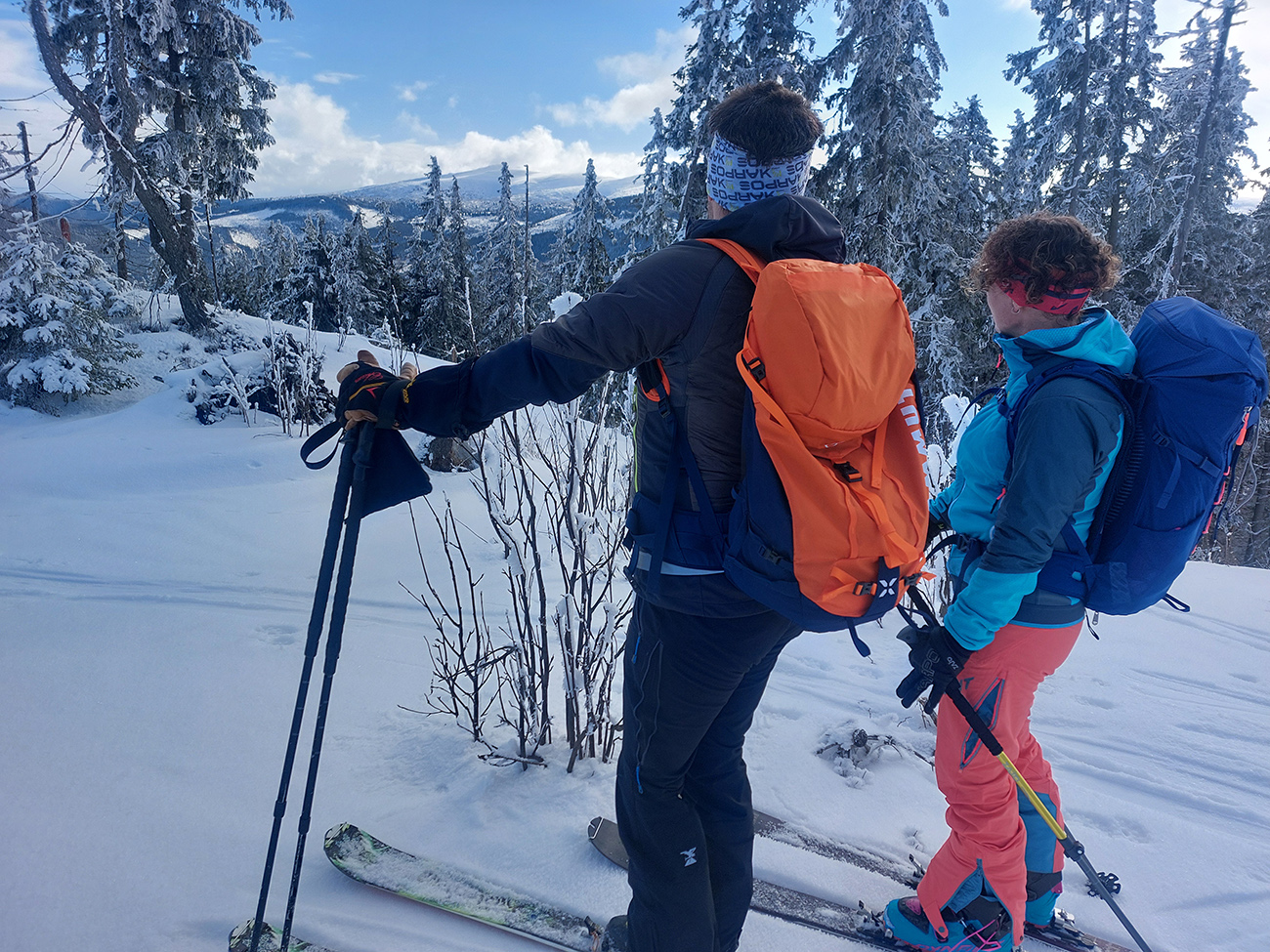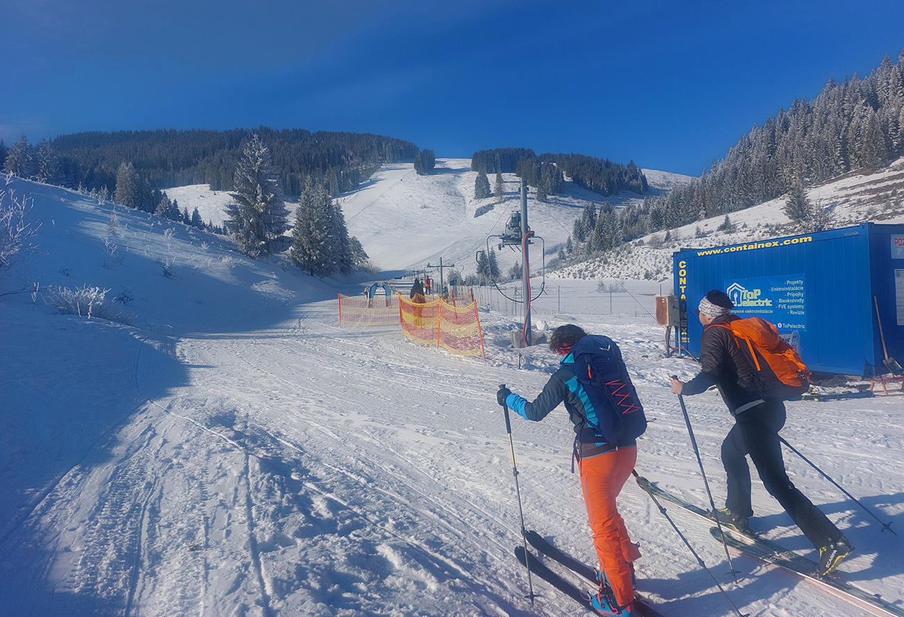 Dalo by sa pokračovať v oblúkovaní až na dno Ždiarskej doliny k tomu smerovníku, ale že radšej nalepíme a prepásujeme sa k tej svetoznámej „búde nárekov“. Lyžovačka pre spestrenie vraj cestou nazad, možno...