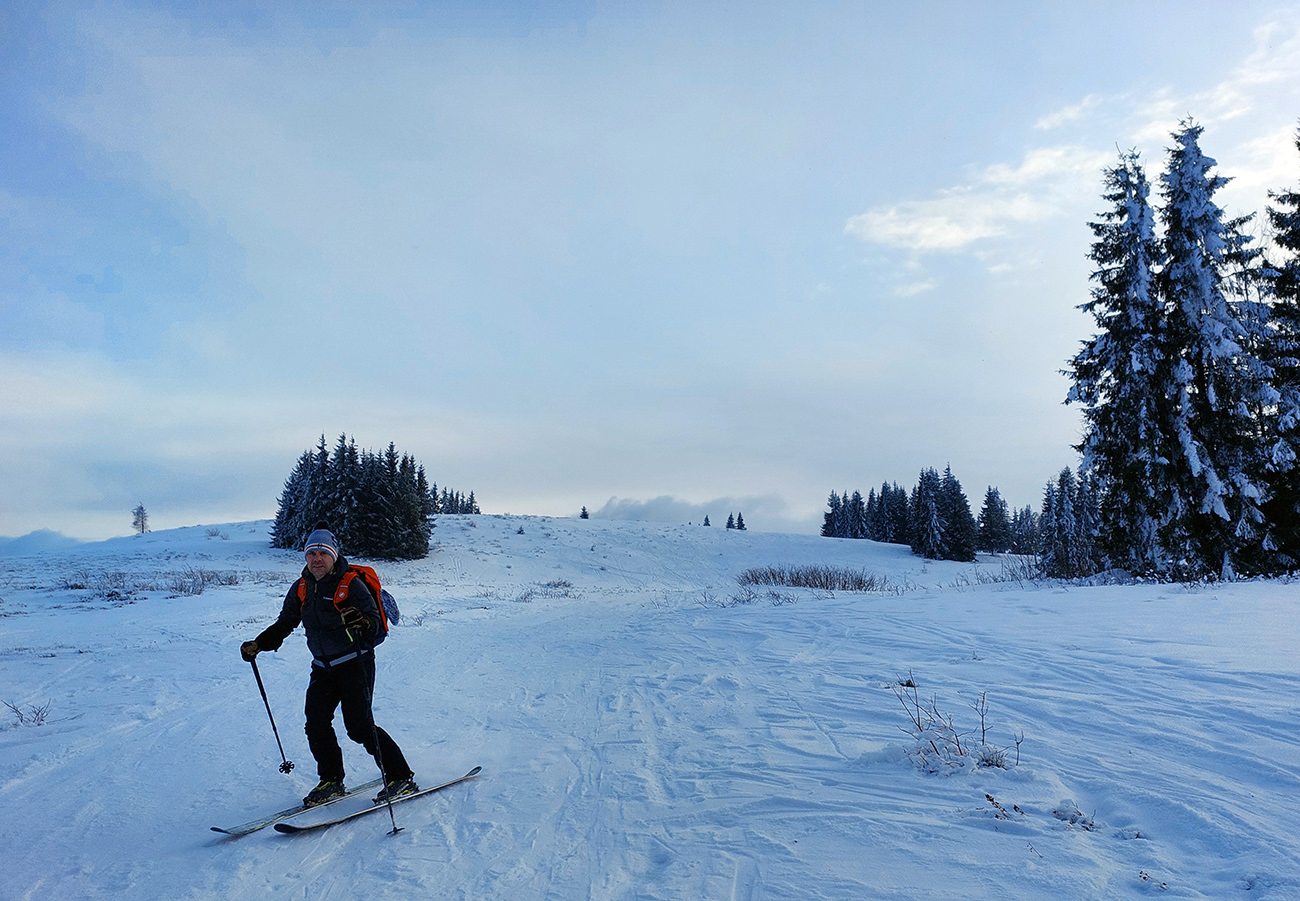 A vôbec to po odmäkoch nebolo ľadové, na starom firne ľahký, premrznutý poprašok, pohodlné! Takže super aj neskôr, pri zjazdoch na pásoch – netrpeli chlpy na ľade a ticho bolo. Hore nad lesom pekný spätný výhľad na Tatry, kde sa ozaj na hrebeňoch dáke chuchvalce držali, zdalo sa: